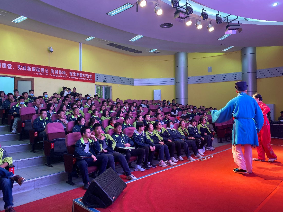學術報告廳內座無虛(xū)席,我校高二年(nián)級三個(gè)班級的學生觀看了演出。 在不到一個小時(shí)的演出裏,市(shì)藝術劇院的藝術家們為同學們帶來了黃梅小戲《夫妻觀燈》、《路遇》、《掛畫》片段和兩首黃梅戲對(duì)唱《夫妻雙雙(shuāng)把家(jiā)還》《十五的月(yuè)亮為誰圓》,讓同學們零距離(lí)了解安徽黃梅(méi)獨(dú)特韻味,感受傳統戲曲(qǔ)文化的魅力,演員們的一(yī)招一式,一笑一顰無不顯示出極高的戲曲功底和(hé)演出水平,精(jīng)彩的表演,讓同學們看的十分投入,不時(shí)與戲中人物(wù)互動,贏得在場師生(shēng)的陣(zhèn)陣喝彩和掌聲。
