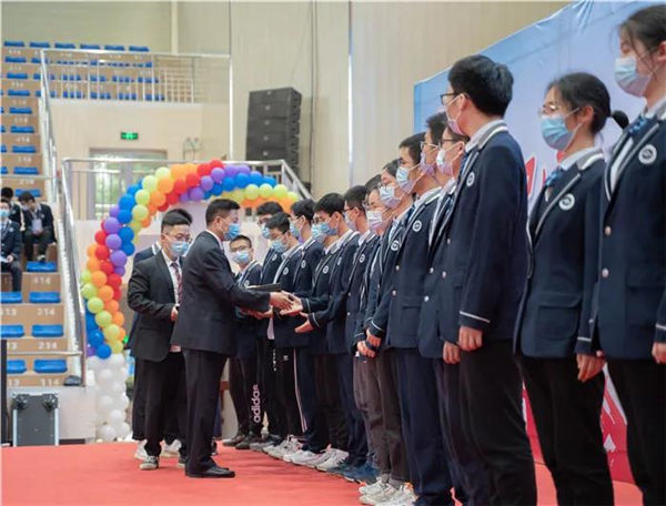 高三(1)班(bān)孫博浩同學帶領全體同學進行了畢業宣(xuān)誓,他(tā)們鏗鏘有力的宣言如同無悔的青(qīng)春承諾回(huí)蕩在會場中。懷著對母校的深深(shēn)眷戀和(hé)美好祝願,全體高三同學也為學校準備了一份禮物,高三年級部主任儲成俊和學生代表高三(3)朱芃輝同學向學校贈送了這份(fèn)特殊的紀(jì)念品——2021屆全體(tǐ)師生合影。
