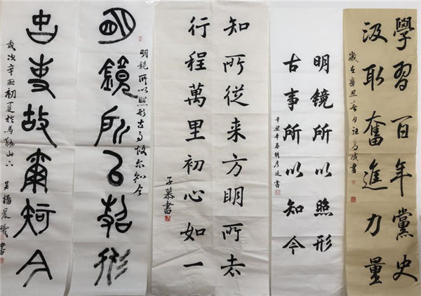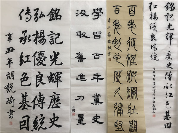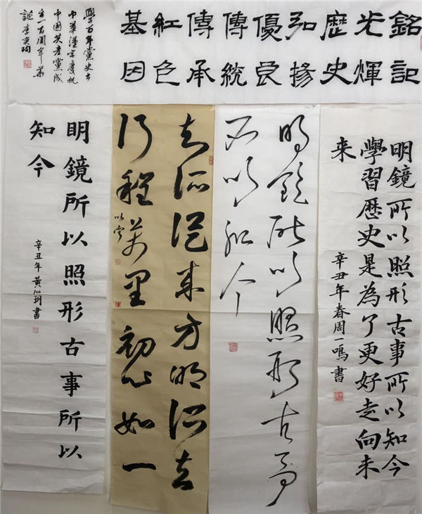 展開一張宣紙(zhǐ),拿起一支(zhī)毛筆,橫豎撇捺,起筆收筆,同學們滿懷激情,各顯身手,呈現了一幅幅精美的軟筆書法作品,或飄逸雋秀,或舒展開闊,或蒼勁(jìn)有力,充分展示了同學們深厚的基本功(gōng)底和(hé)對(duì)軟筆書法的熱愛。“百(bǎi)年征(zhēng)程波瀾壯闊百年初心曆久彌堅”“學史明理 學史增信 學史崇德 學史(shǐ)力行(háng)”“學習百年黨史 汲取奮進力量”“明鏡所以照形 古事所以知今”……一(yī)個個優美流暢(chàng)的漢字躍然紙上,一句句學習感悟留於心間。