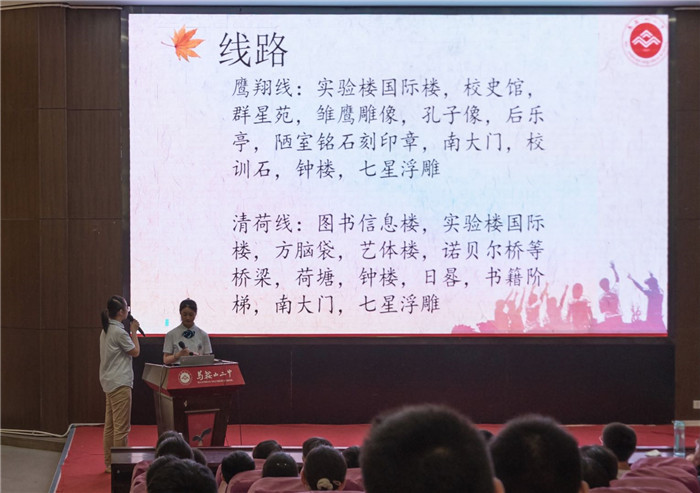 接下來是室外活動(dòng)的環節。八名講解(jiě)員帶領高一新生分“鷹翔”“清荷”等四條主題線路線路參觀了校園。線路的名字也都頗具內(nèi)涵:“鷹翔(xiáng)”代表著二中(zhōng)學子孜孜(zī)以求的卓越精神和極目四野的開(kāi)放心(xīn)態,“清荷”象(xiàng)征著二中師生香遠益清的高潔情懷和海納(nà)百川的包容精神。