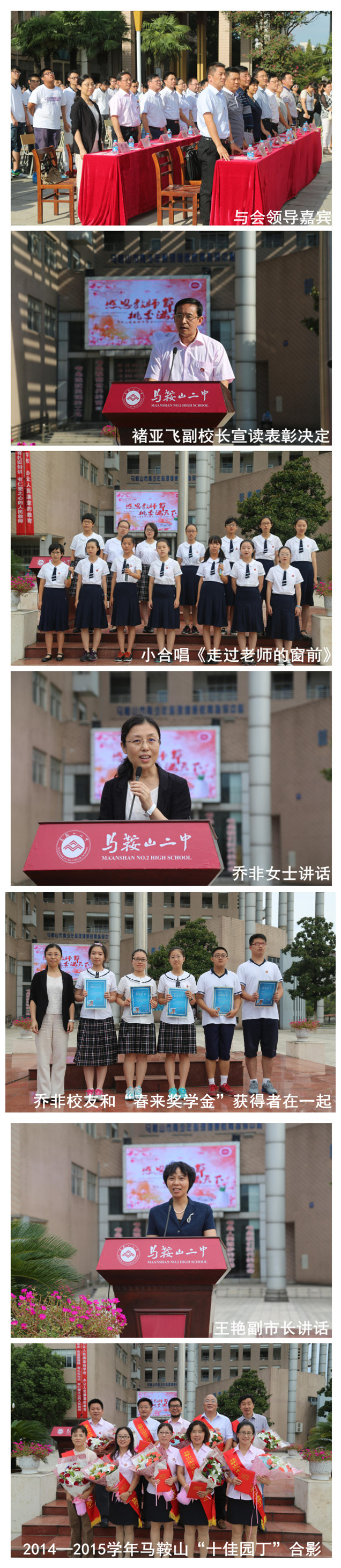 9月10日(rì)上午8:30,馬鞍山二中隆重召開(kāi)大會,慶祝第31個教師節,舉行“十佳園丁”“春來獎(jiǎng)學金”頒獎典禮。馬鞍山市政府副市長王豔女士,馬(mǎ)鞍山市政府副秘書長(zhǎng)劉方文先(xiān)生,馬鞍山市教育局局長王炳祥先生(shēng),馬鞍山農村商業銀(yín)行行長金輝先生,安徽唯因篤裝(zhuāng)飾工程(chéng)有限公司總經理王保生先(xiān)生(shēng),泰爾重工股份有限公司董事長助理孫曼曼女士,馬(mǎ)鞍山市新華書店有限公司總經理徐雁苗先生,安徽長(zhǎng)江礦業有限公司副總經理杜漢青(qīng)先生,馬鞍山金申置業有(yǒu)限公司副總經理任祖強先生,馬鞍山匯成置(zhì)業有限公司(sī)辦公室主任張玉森先生,同濟大(dà)學電子與信息工程(chéng)學院教授、博(bó)士生導師(shī)、馬鞍(ān)山二中1985屆畢業生喬非女(nǚ)士,馬鞍山二中(zhōng)黨委副書記、副校長郭惠宇先生,馬鞍山二中(zhōng)副校長王玉平先生,馬鞍山二中副校長褚亞飛先生,馬鞍山二(èr)中工會(huì)主席畢小紅(hóng)女士,馬鞍山二中全體師生,一起共(gòng)同見證了這個難(nán)忘(wàng)的日子。