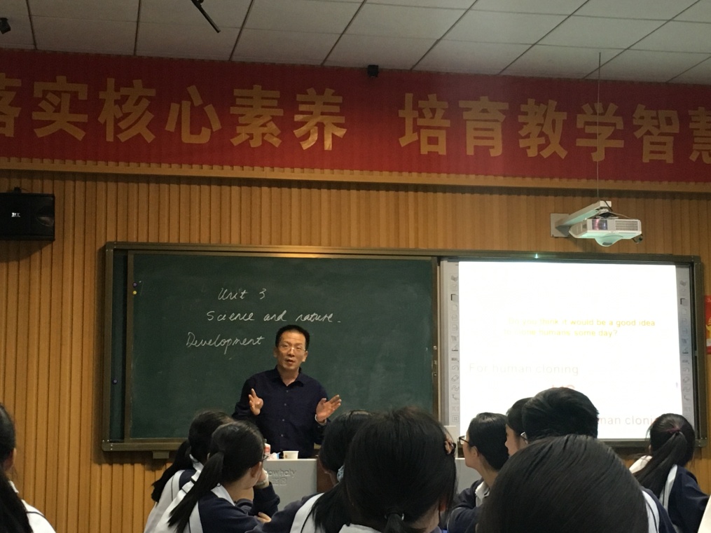 第二(èr)節課由唐曉文老師帶來模塊五(wǔ)第三單元Welcome to the Unit部分(fèn),探討克隆技術的發展和影響。開篇巧妙結合時事——十九大的召開引出話題,豐富的視(shì)頻(pín)素材活躍了課堂氛圍,不斷搭建的支(zhī)架幫助了學生口語輸出。最後(hòu)的辯論環節將整節課推向了高潮,學生出眾的課堂表現,老師精彩的課堂小結,為本節課畫上了圓滿的句號。而唐老師的微笑和幽默亦如和煦春風,溫暖了在場的所(suǒ)有(yǒu)學生和聽課教師。