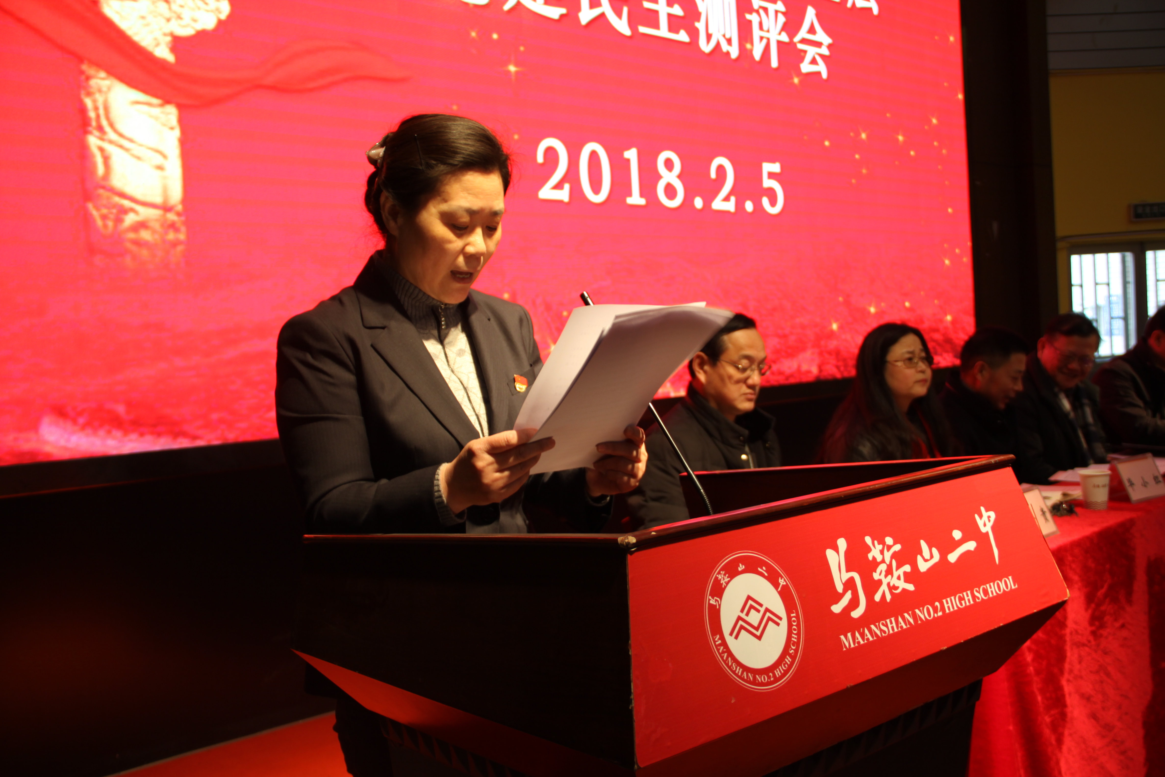 2月5日下午三點,馬(mǎ)鞍山二中(zhōng)黨委在圖書館一樓報告廳召(zhào)開2017年黨委書(shū)記抓基層黨建民主測評會,校黨(dǎng)委書記聶曉霞同誌代表校黨委作本年(nián)度(dù)述職報告(gào),市教育局黨委書記、局長楊(yáng)才餘同誌出席會議並作點評講話,二中全體黨(dǎng)員參會。