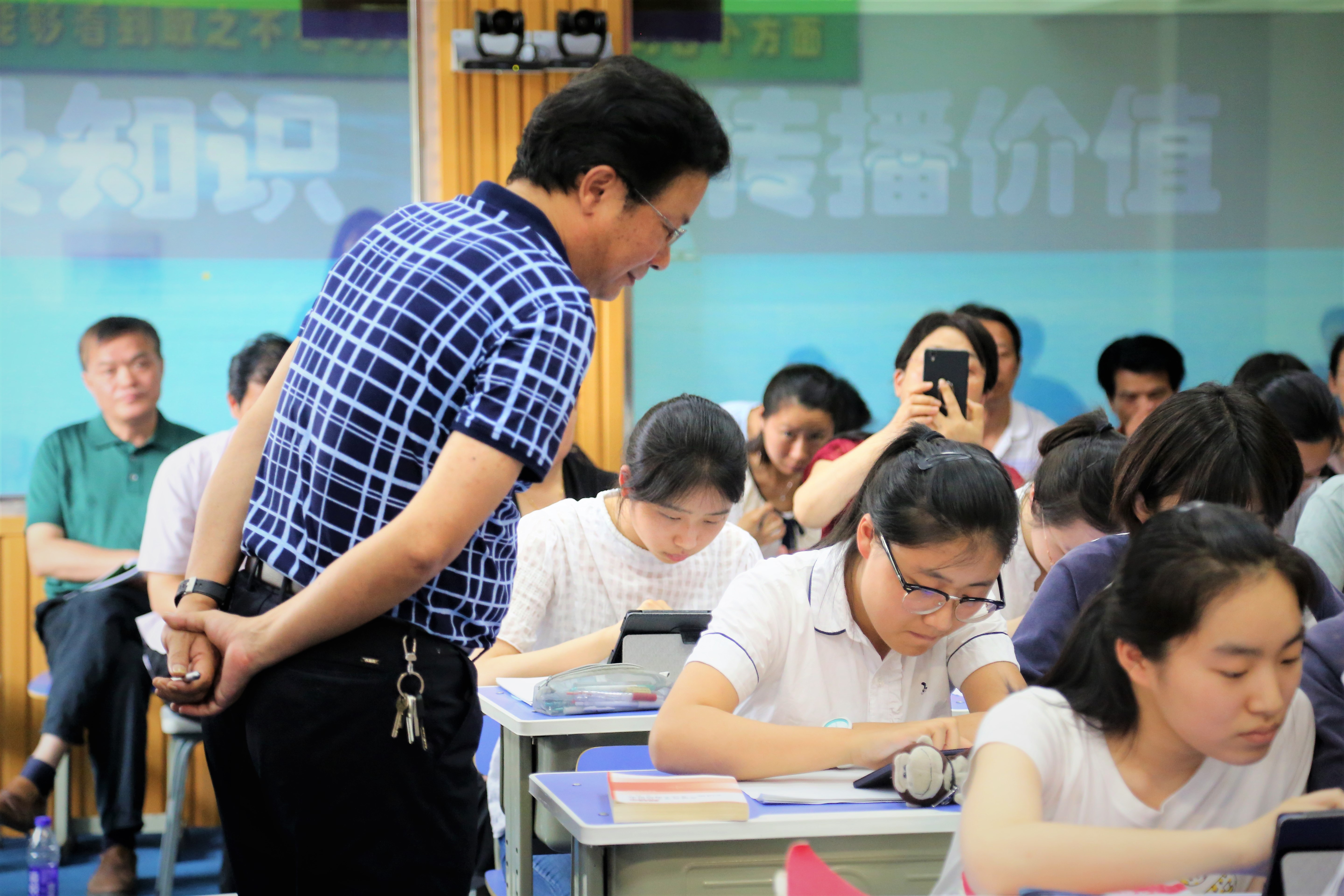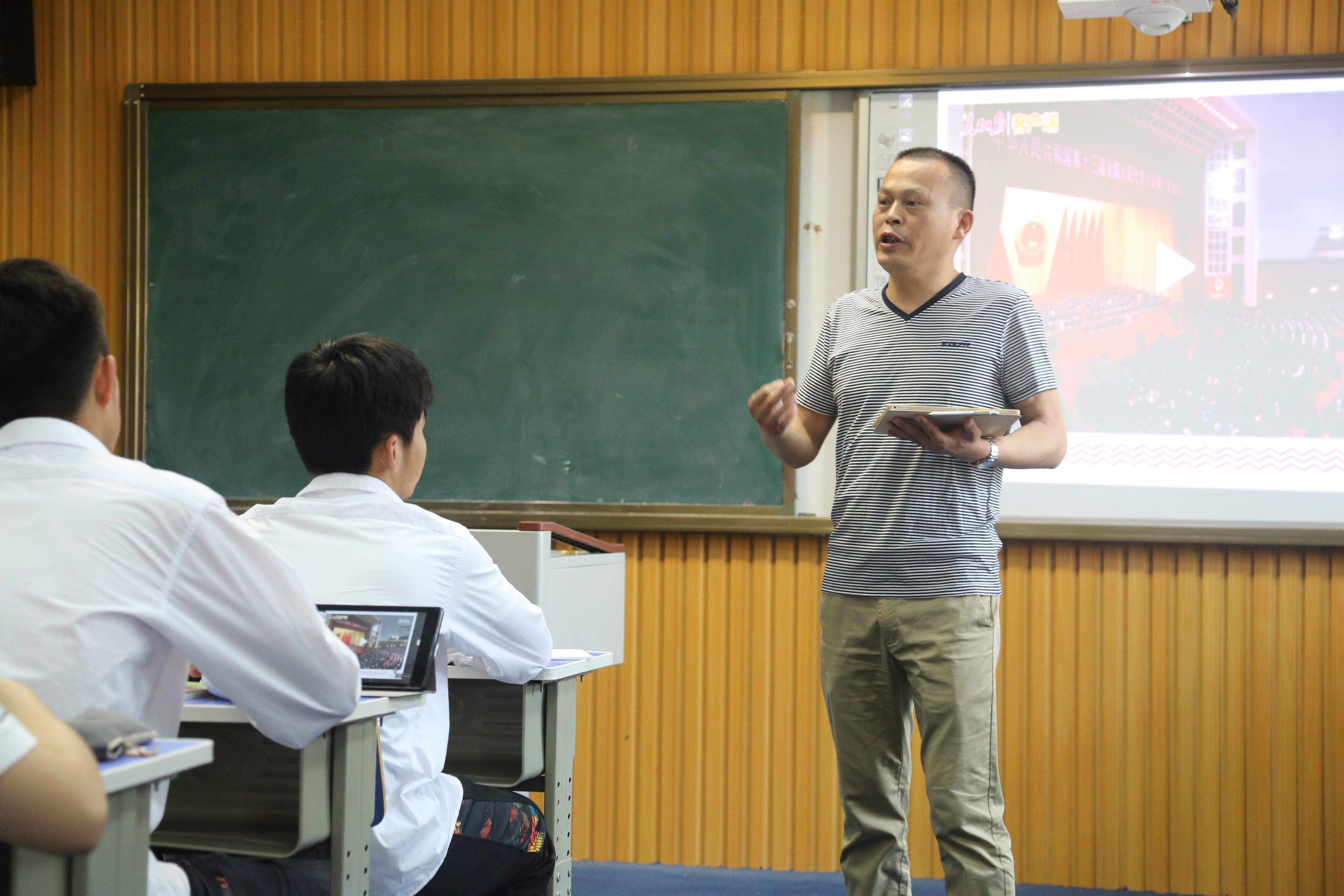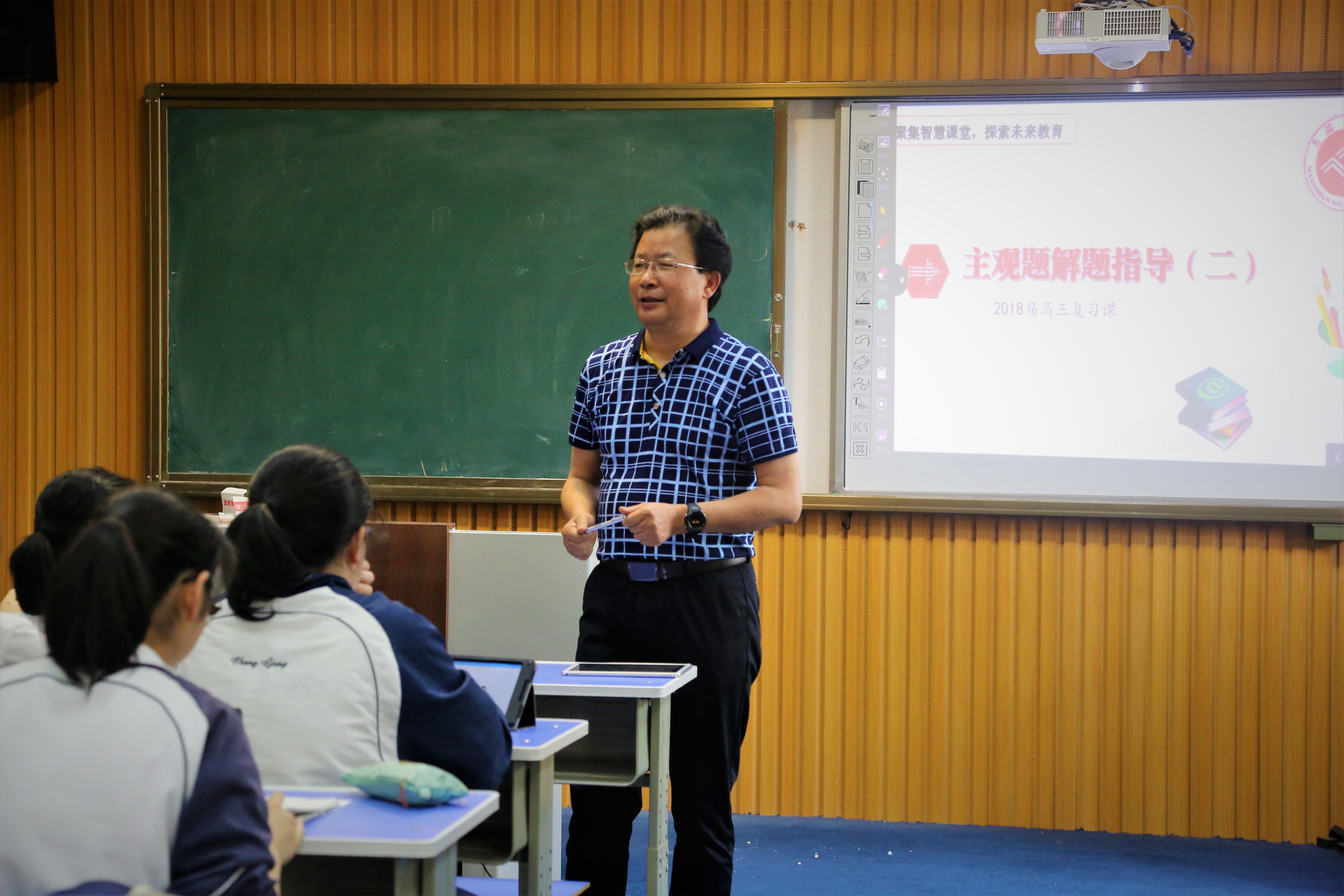 5月17日下午,政治組火炬接力人陳(chén)筱(xiǎo)婉老師和陳光慧老師以及特(tè)邀授課人伍玉魁老師(shī)在錄(lù)播教(jiāo)室開設了三節智慧課堂公開課,來自市縣約四十位政治教師前來觀摩,黨委(wěi)書記聶曉霞參與聽課。