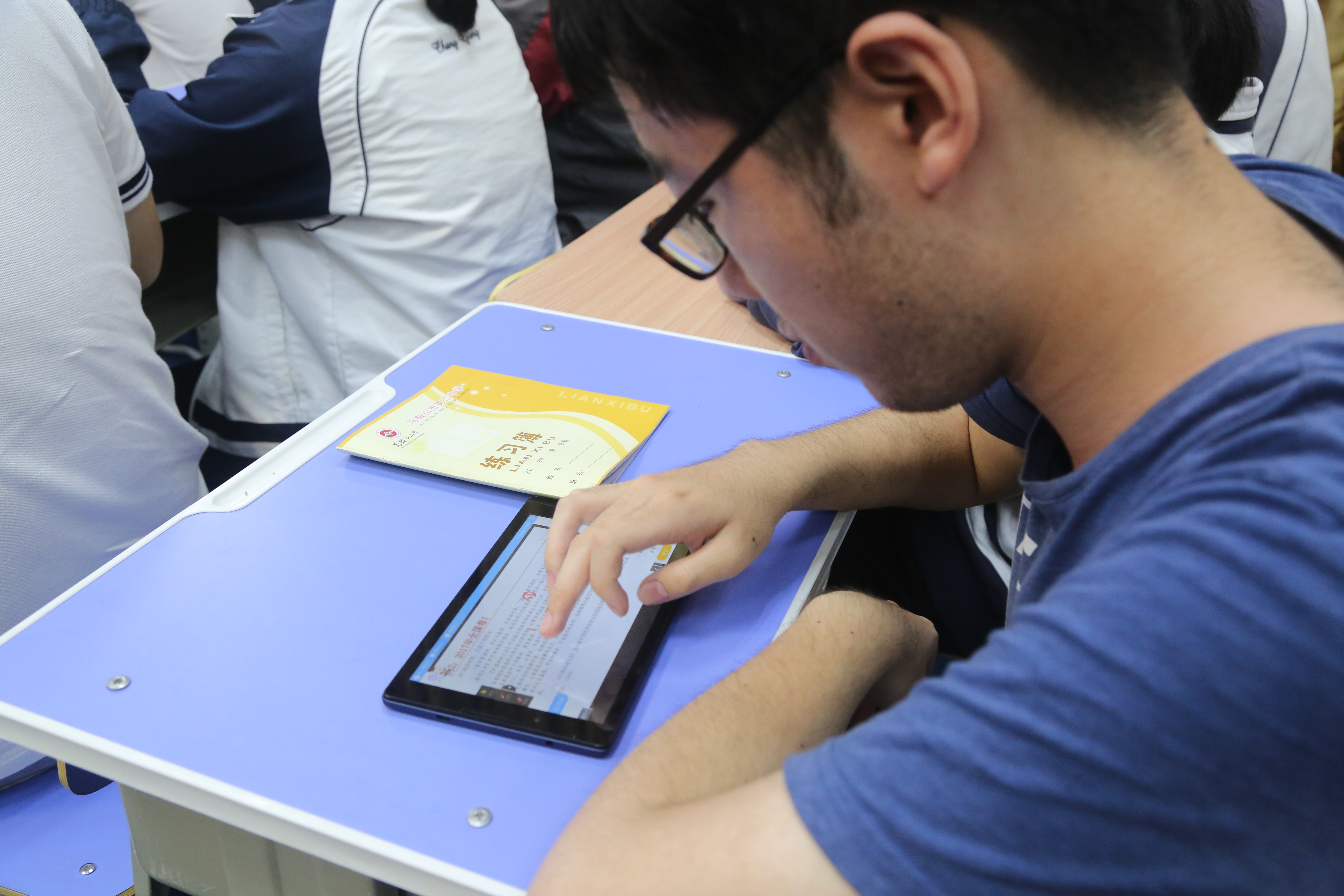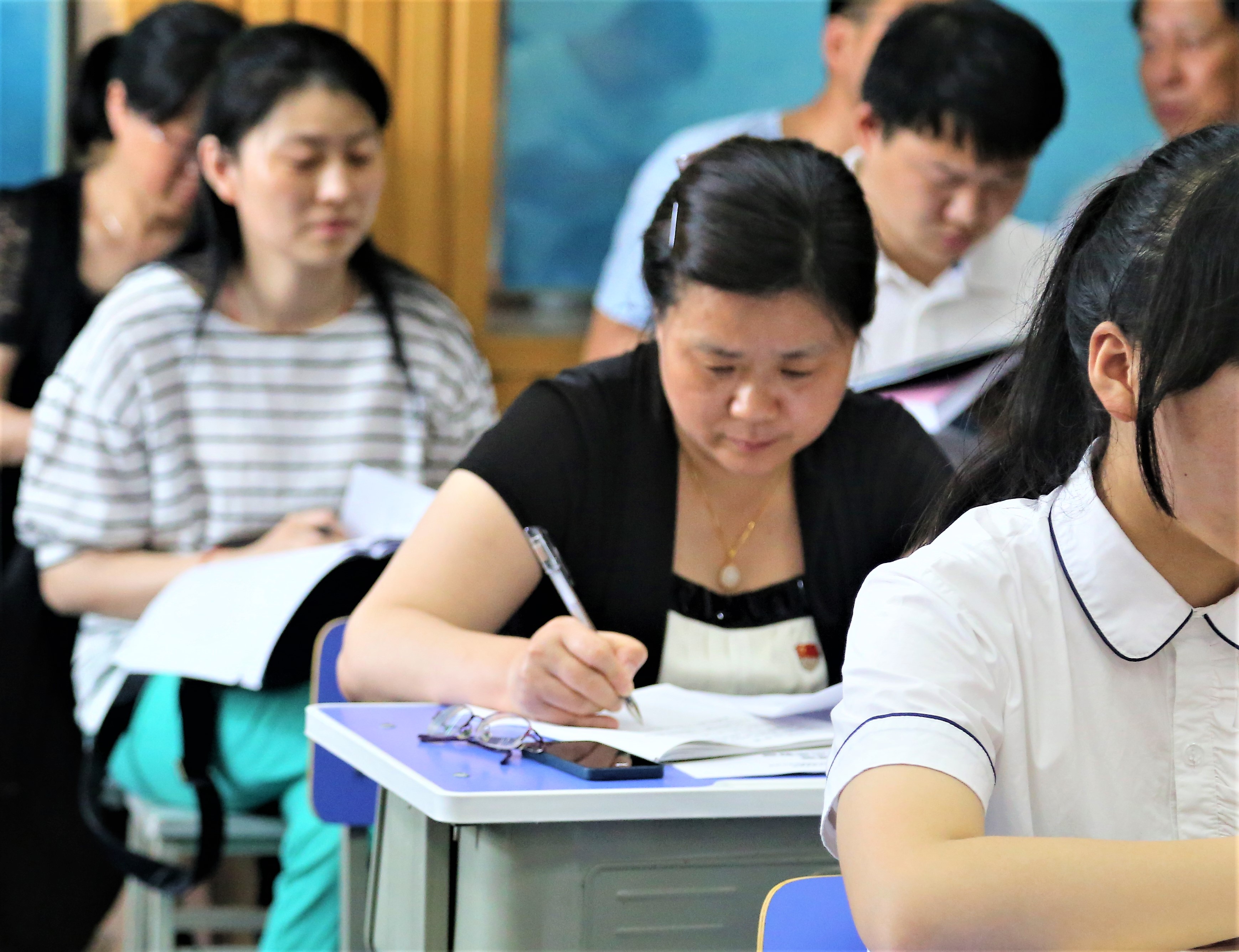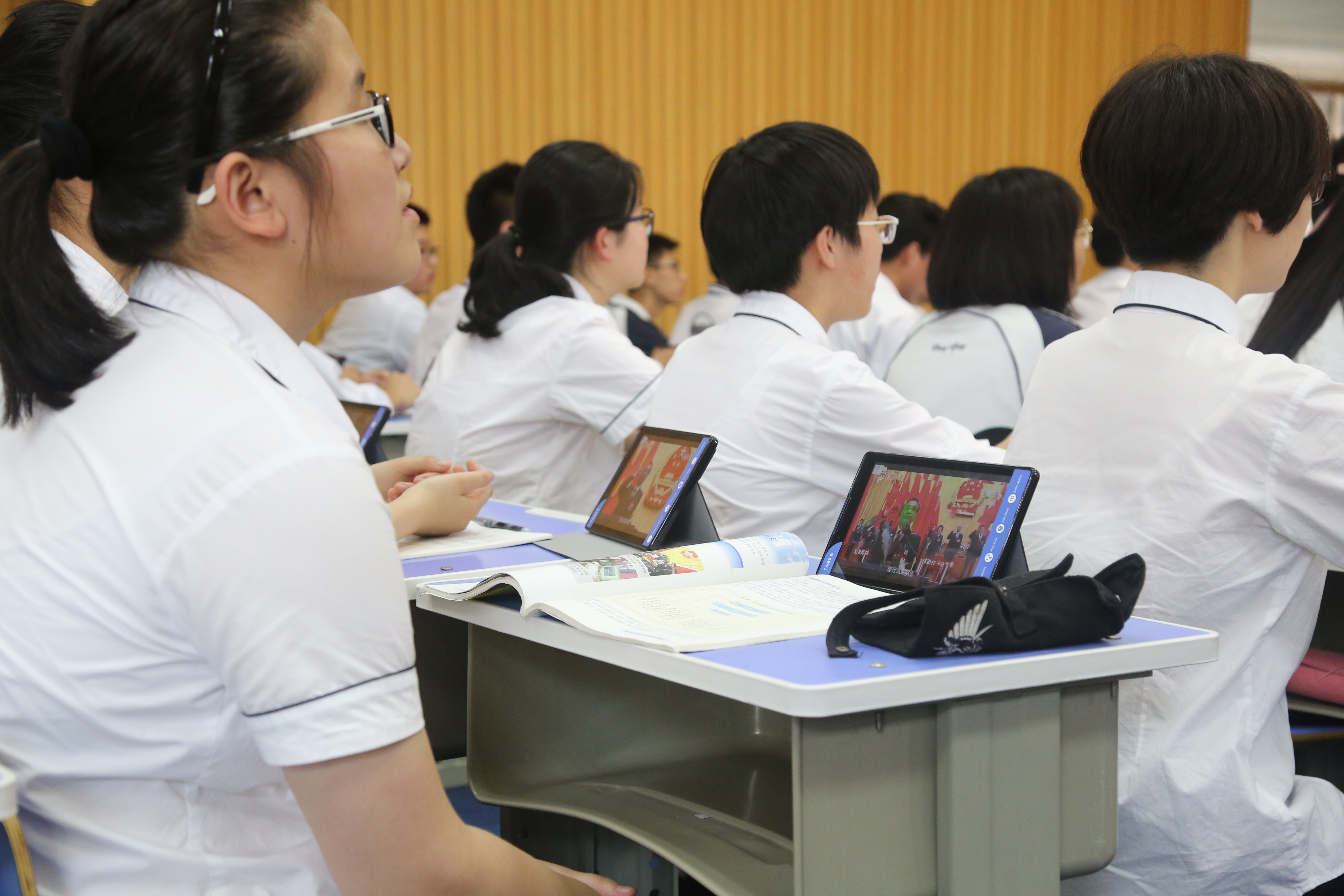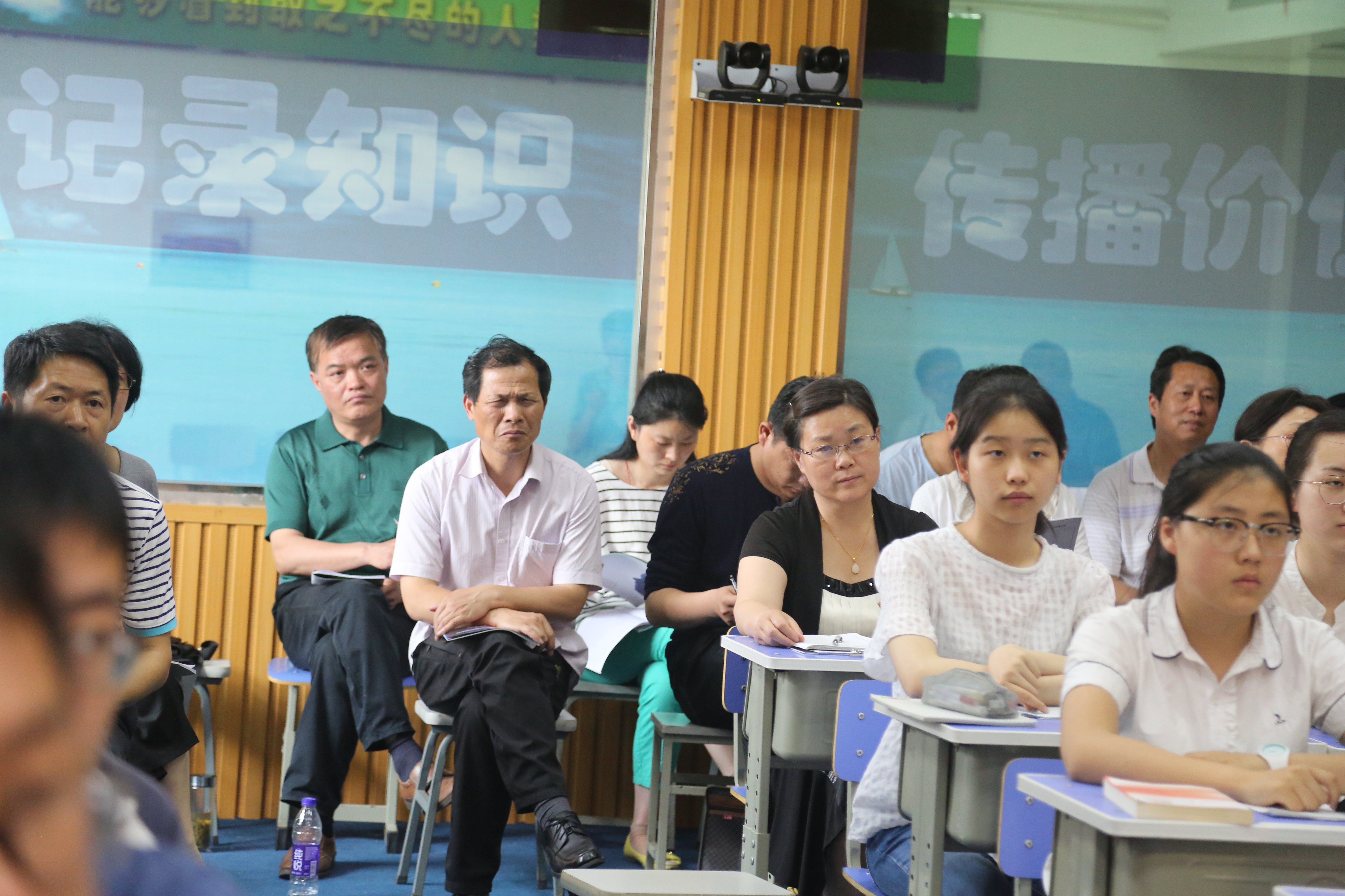 5月17日下午,政治組火炬接力人陳(chén)筱(xiǎo)婉老師和陳光慧老師以及特(tè)邀授課人伍玉魁老師(shī)在錄(lù)播教(jiāo)室開設了三節智慧課堂公開課,來自市縣約四十位政治教師前來觀摩,黨委(wěi)書記聶曉霞參與聽課。
