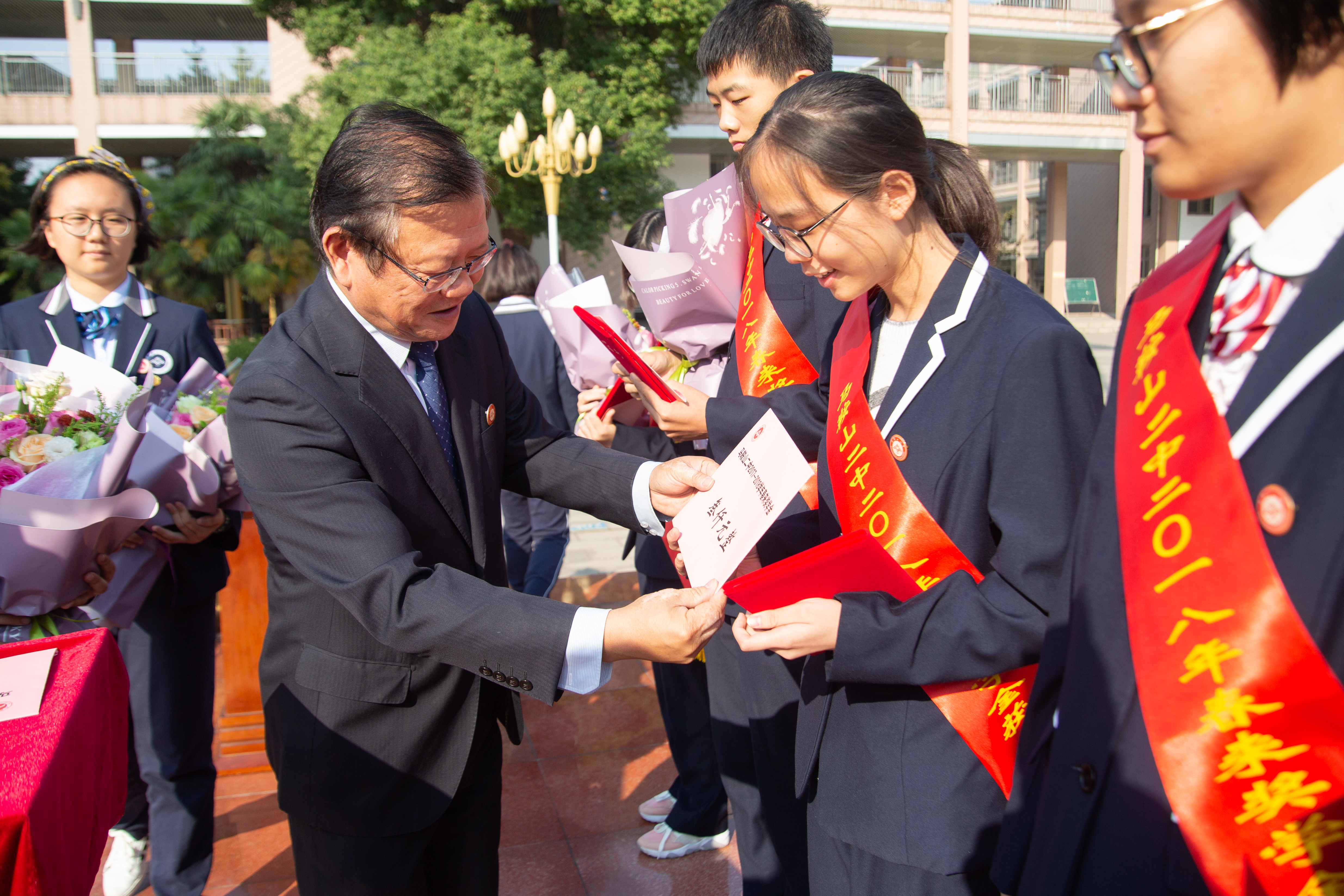 10月12日上午7點50分,馬鞍山二中2018年“十佳園(yuán)丁”頒獎典(diǎn)禮在校園廣(guǎng)場隆重舉(jǔ)行。出席典禮並為獲獎教師頒獎的領導和嘉賓有:馬(mǎ)鞍山市教育局黨委書記、局長汪昌(chāng)斌,安徽工業大學校長魏先文,馬鞍山市教育局調研員王俊,馬鞍山農村商業銀行行長金(jīn)輝(huī),安徽唯因篤裝(zhuāng)飾工程有限公司董事長王保生,泰爾(ěr)重工股份有限公司黨委書記劉新(xīn)生,馬鞍(ān)山金申置業發展有限公司執行董事、總經理任祖強(qiáng),馬鞍山市新華(huá)書店有限公司總經理徐雁苗,馬鞍山(shān)福建商會副秘書長,馬鞍山匯成置(zhì)業辦公室主任(rèn)張玉森,馬鞍山二中(zhōng)教育基金會理事長汪延茂(mào),馬鞍山二中郭惠宇校長,馬鞍(ān)山二中(zhōng)黨委聶曉霞書記,馬鞍山二中王玉平副校長(zhǎng),馬鞍山二中褚(chǔ)亞飛副校長,馬鞍(ān)山二中副校長慶曉,馬鞍山二中工會主席畢小紅(hóng)。全校師生代表3000餘人參加了本次活動(dòng)。