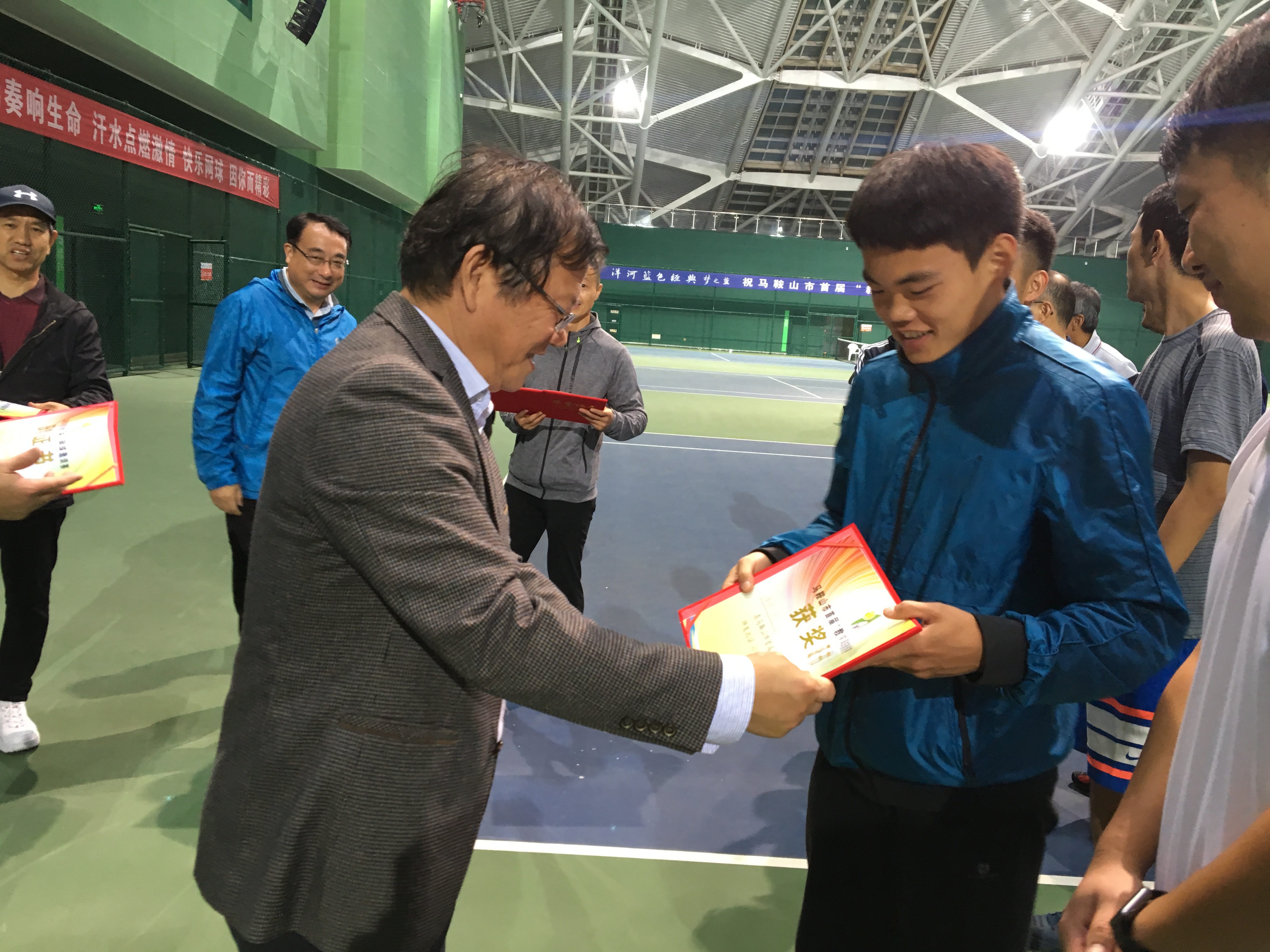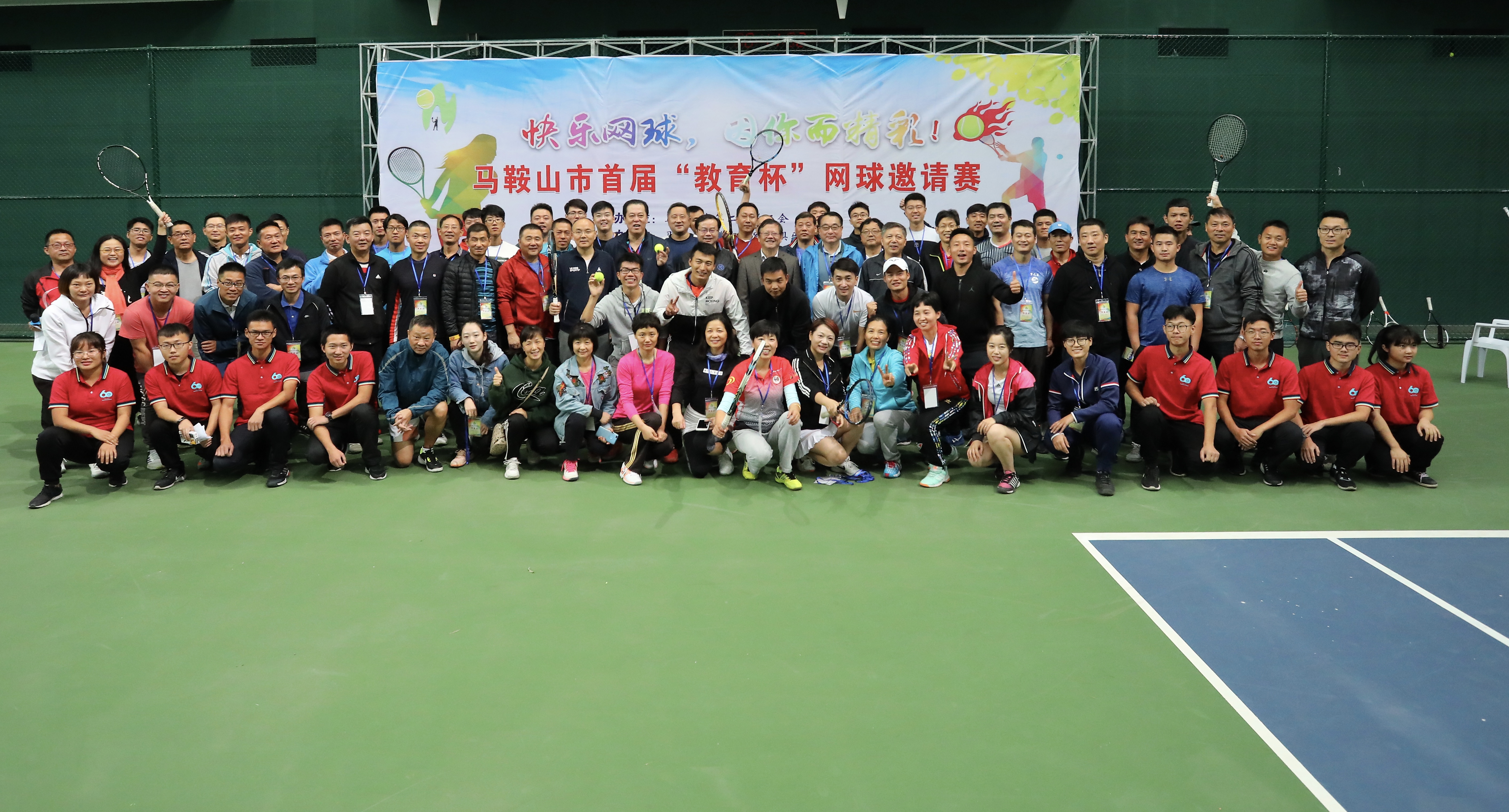 1021日,馬鞍山市體育會展中心網球館迎來了市首(shǒu)屆“教育杯”網球邀請賽,活動的主辦單位是馬鞍山(shān)二中(zhōng)工會,協(xié)辦單位是市教職工網球俱樂部和市奧格(gé)愛瑪(mǎ)體育文化(huà)發展有限(xiàn)公司,馬鞍山木易商貿有限(xiàn)公(gōng)司給予了友情讚助(zhù)。全市各個單位的網球愛好者們組織了12支代表隊參加(jiā)本次團體賽,比(bǐ)賽分三(sān)對雙打組(zǔ)成,分別是第一青(qīng)年男子雙打,第二男女混(hún)合雙(shuāng)打,第三(sān)常青男子雙打,經過一整天激烈的比賽,最終教育一隊獲(huò)得了冠軍、徽行一(yī)隊獲得了亞軍,並列第三名分別是馬(mǎ)鋼代表隊和偉鴻(hóng)奧體一隊。