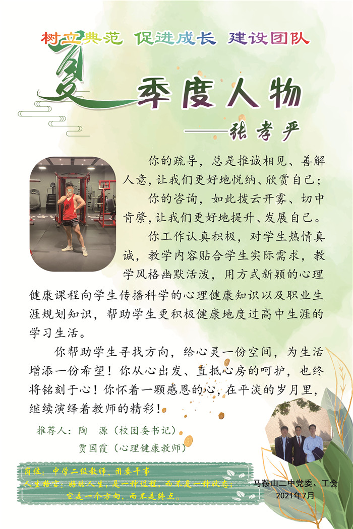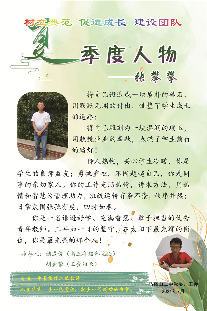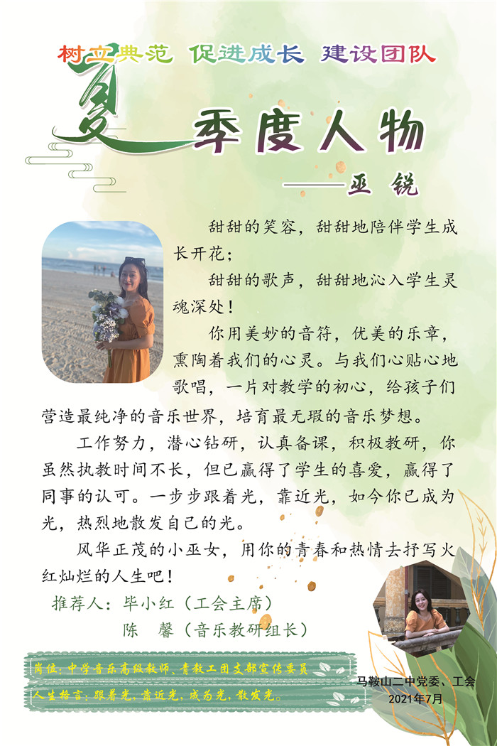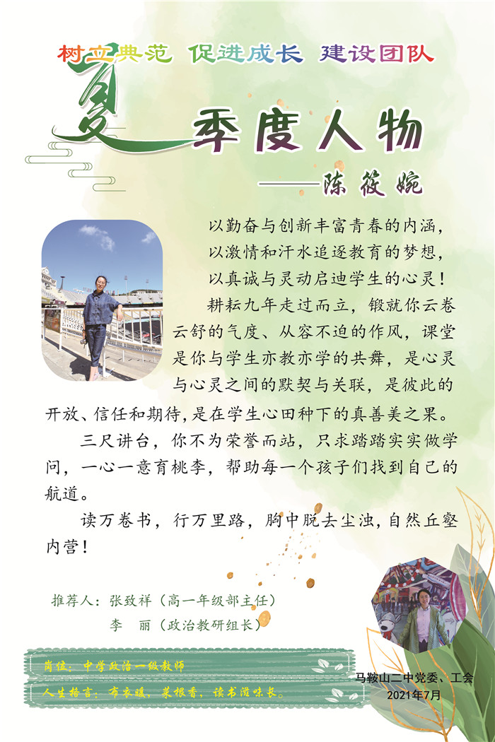 根據年級部、工會小組、資深(shēn)教師的推(tuī)薦,經過由工會委員、組長(zhǎng)組成的(de)推委會認真評(píng)審後,獲得2021年第(dì)二季度(dù)(總第二十六(liù)期)“季度人物”光榮稱號的(de)是:陳筱婉、萬雪迎、張攀攀、高瑩、張(zhāng)孝嚴、巫銳六位老師(shī)。