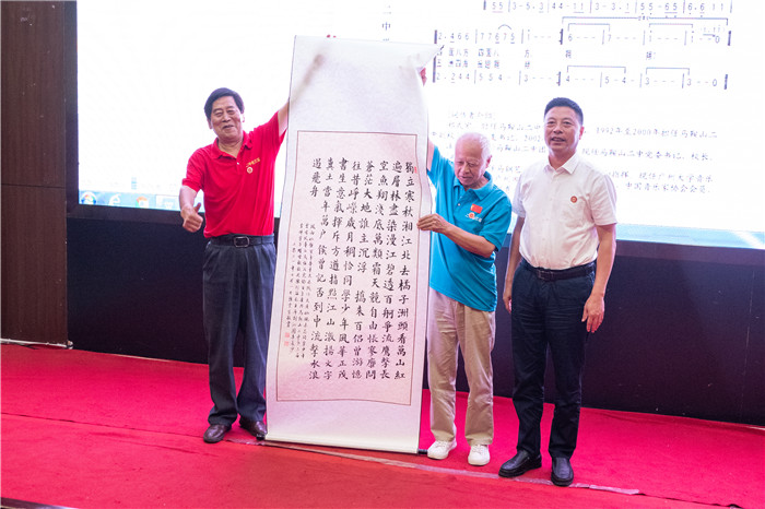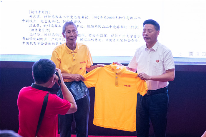 校友代表向學校贈送老三(sān)屆校友名冊、書法作品和活動文(wén)化衫。