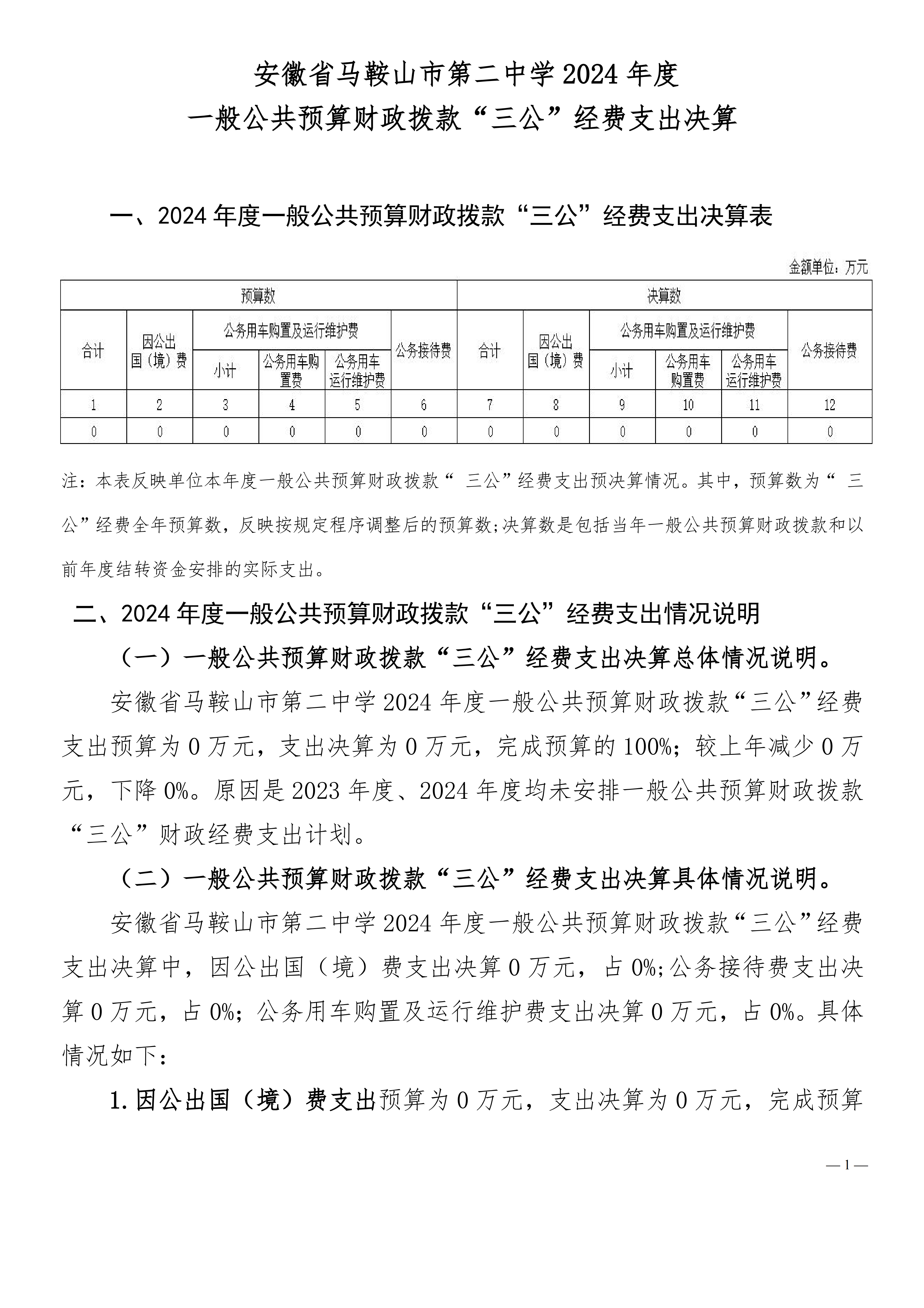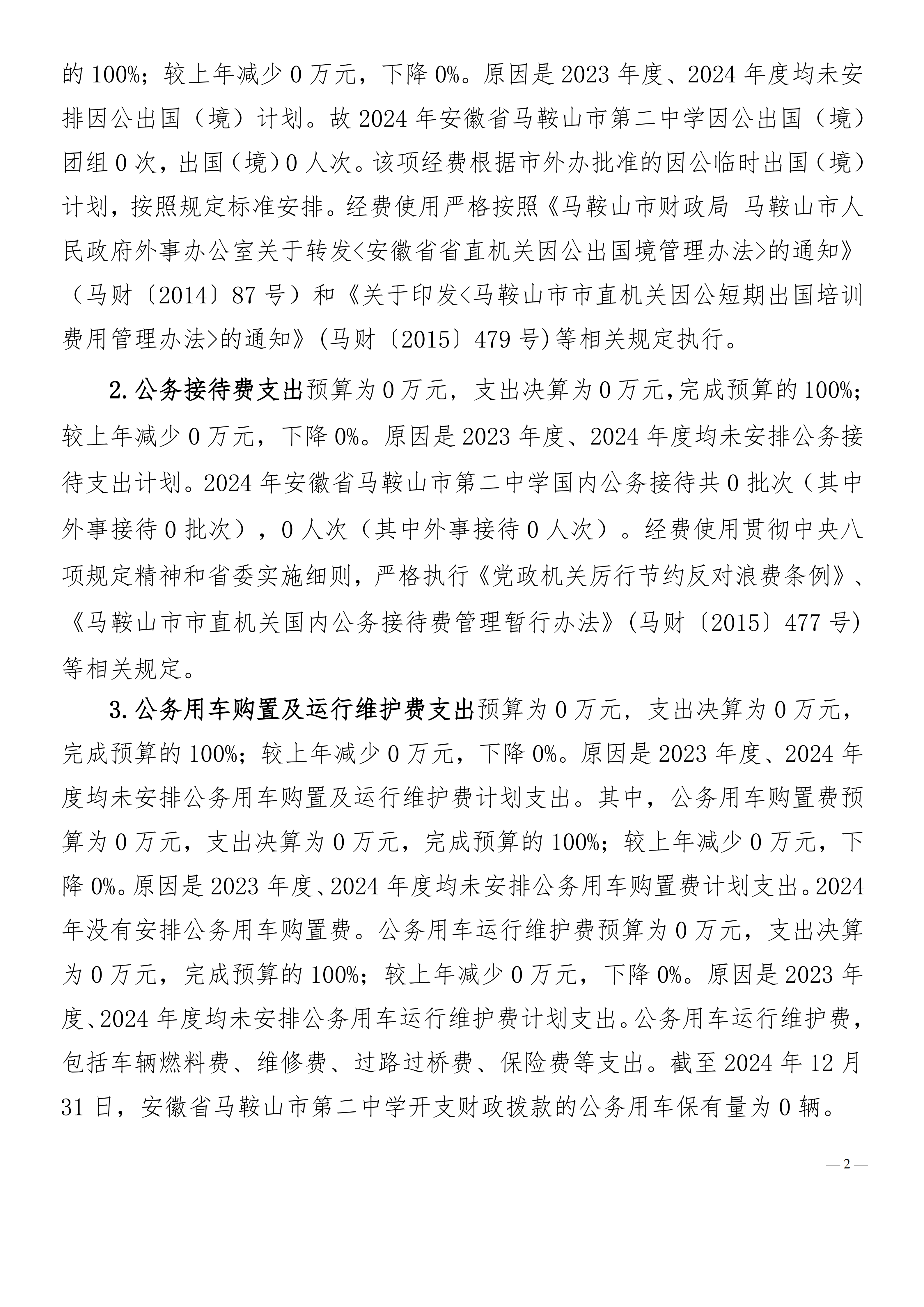 安徽(huī)省馬鞍(ān)山(shān)市第二中學(xué)2024年一般公共預算財政撥(bō)款“三公(gōng)”經費支出決算