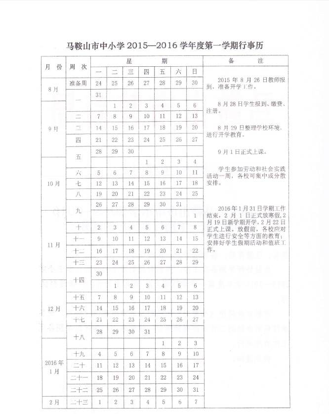 馬鞍山(shān)市中小學2015-20I6學年度第一學(xué)期行事曆