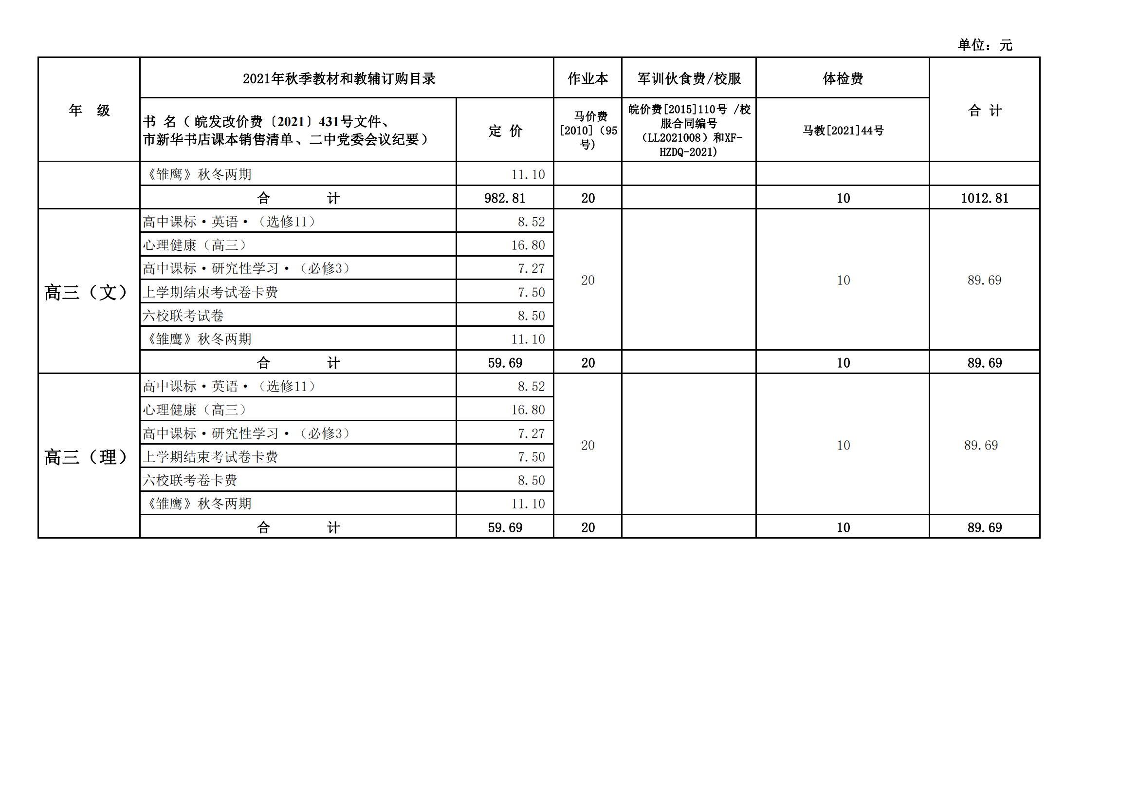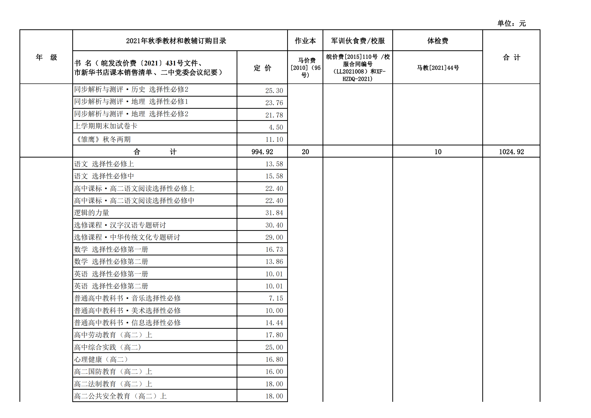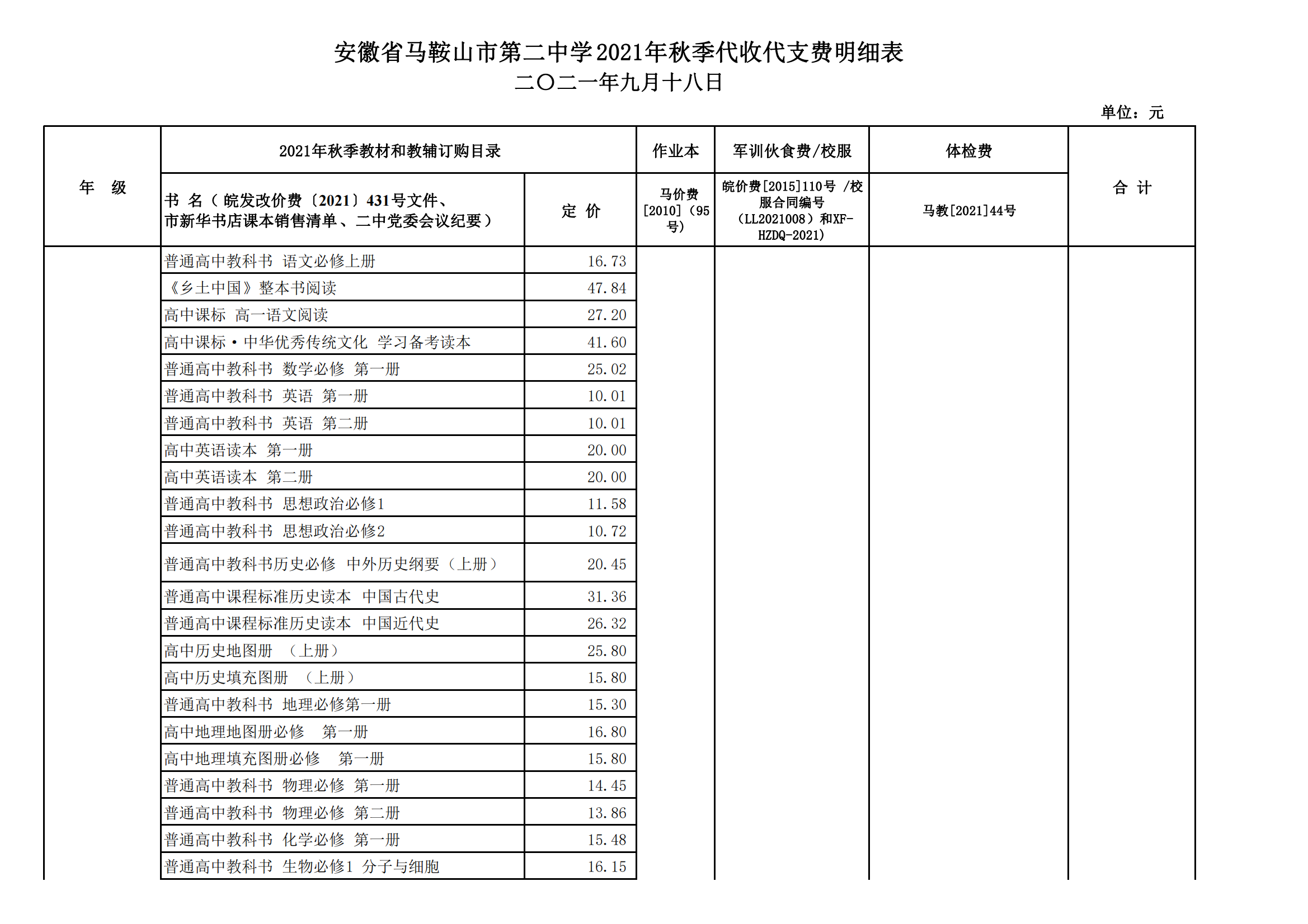 安徽省馬鞍山市第二中學2021年秋(qiū)季代收代支費明細表