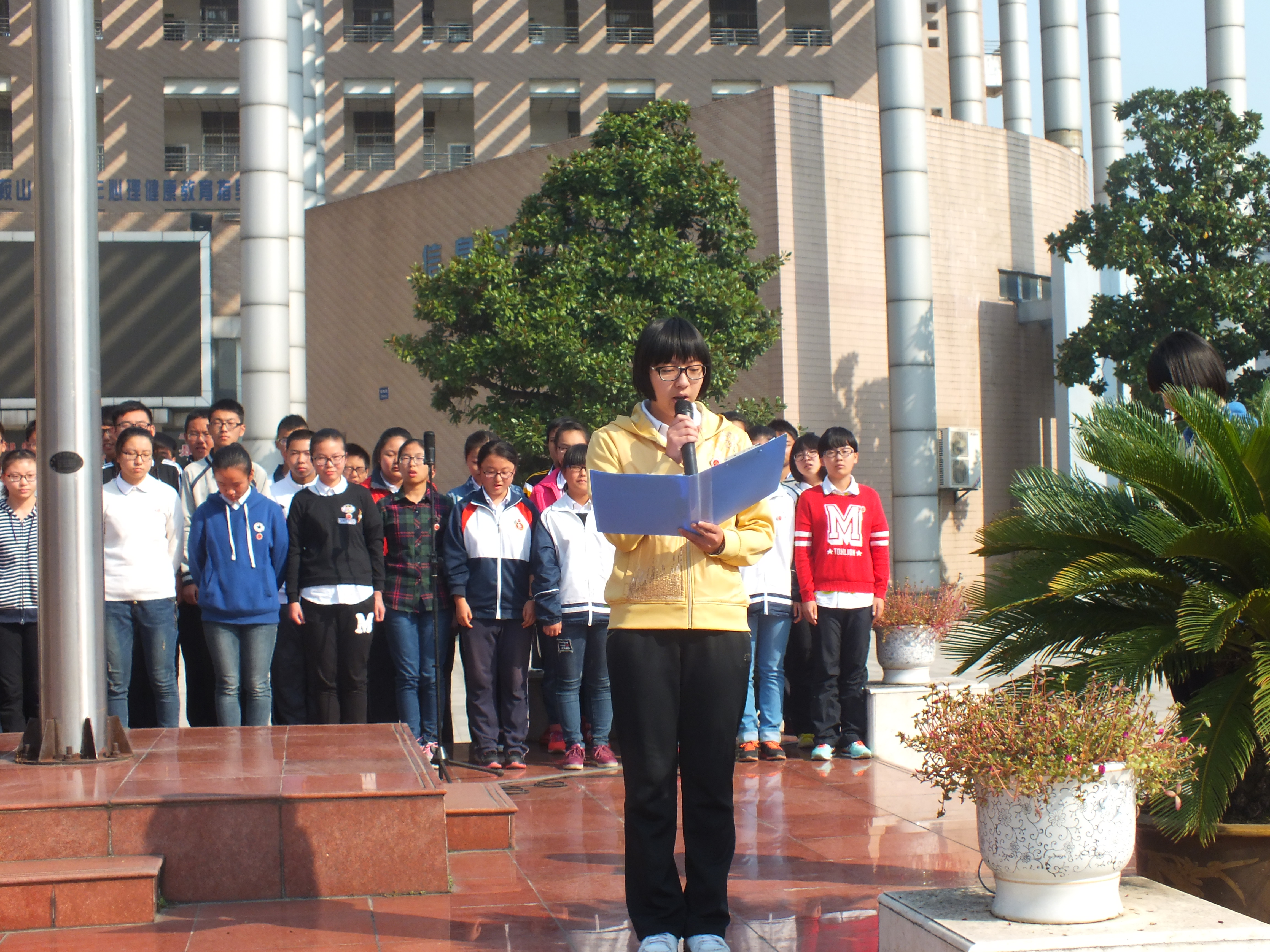 今(jīn)天國旗下講話的(de)同學是,來自高一(yī)九班的生活委員黃莉雲,她(tā)團結同學,愛護集體,尊敬師長,在軍(jun1)訓期間獲得“優秀營員”的(de)稱號。