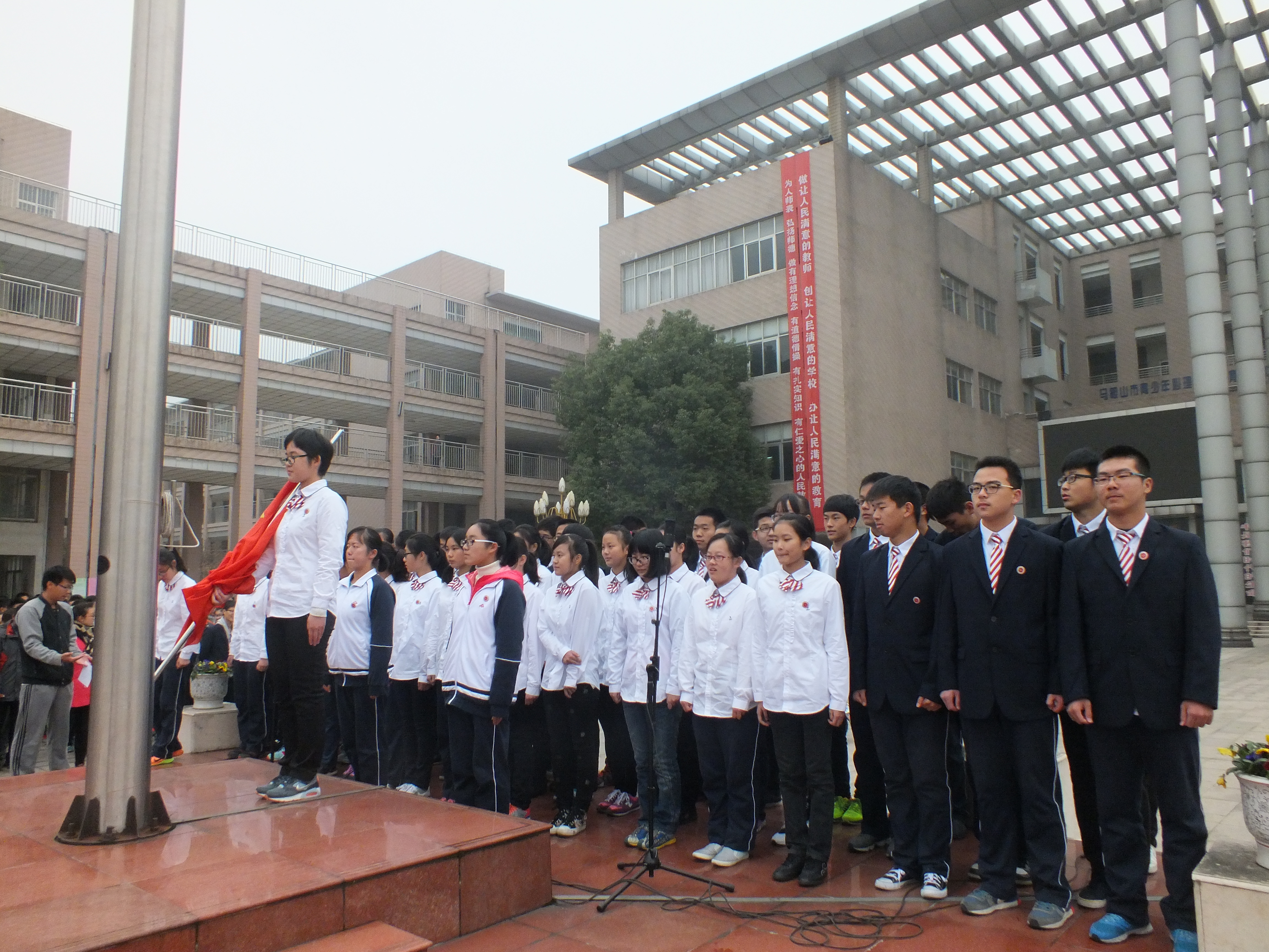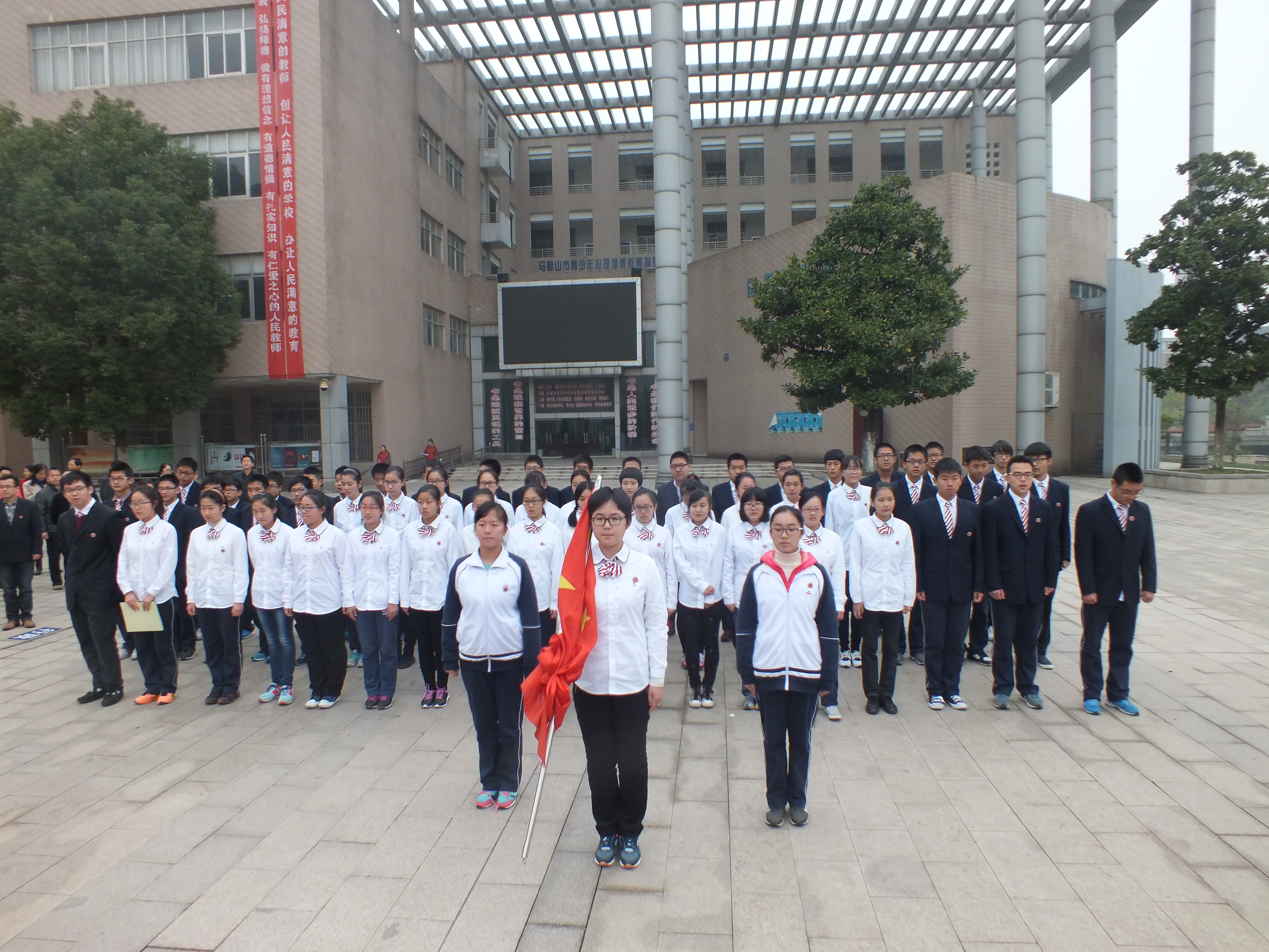 擔任今天升旗儀式(shì)旗手的是來自高一(yī)(13)班的趙昕洋同學。擔任今天護旗(qí)手(shǒu)的是來自高(gāo)一(3)班的黨逸塵和汪軼誠同學。