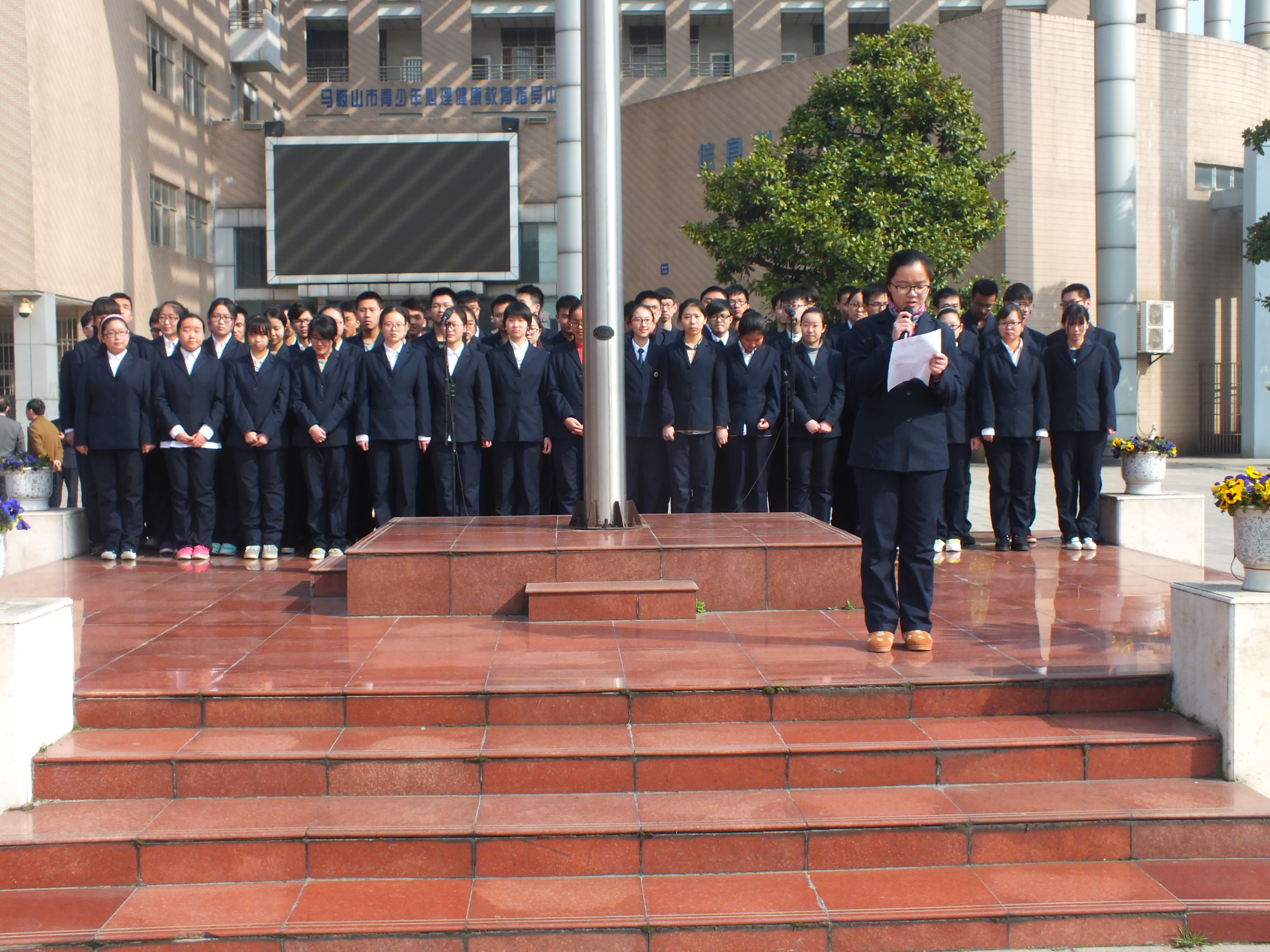 今天擔任(rèn)國旗下領唱的(de)是來自高5)班的同學們。