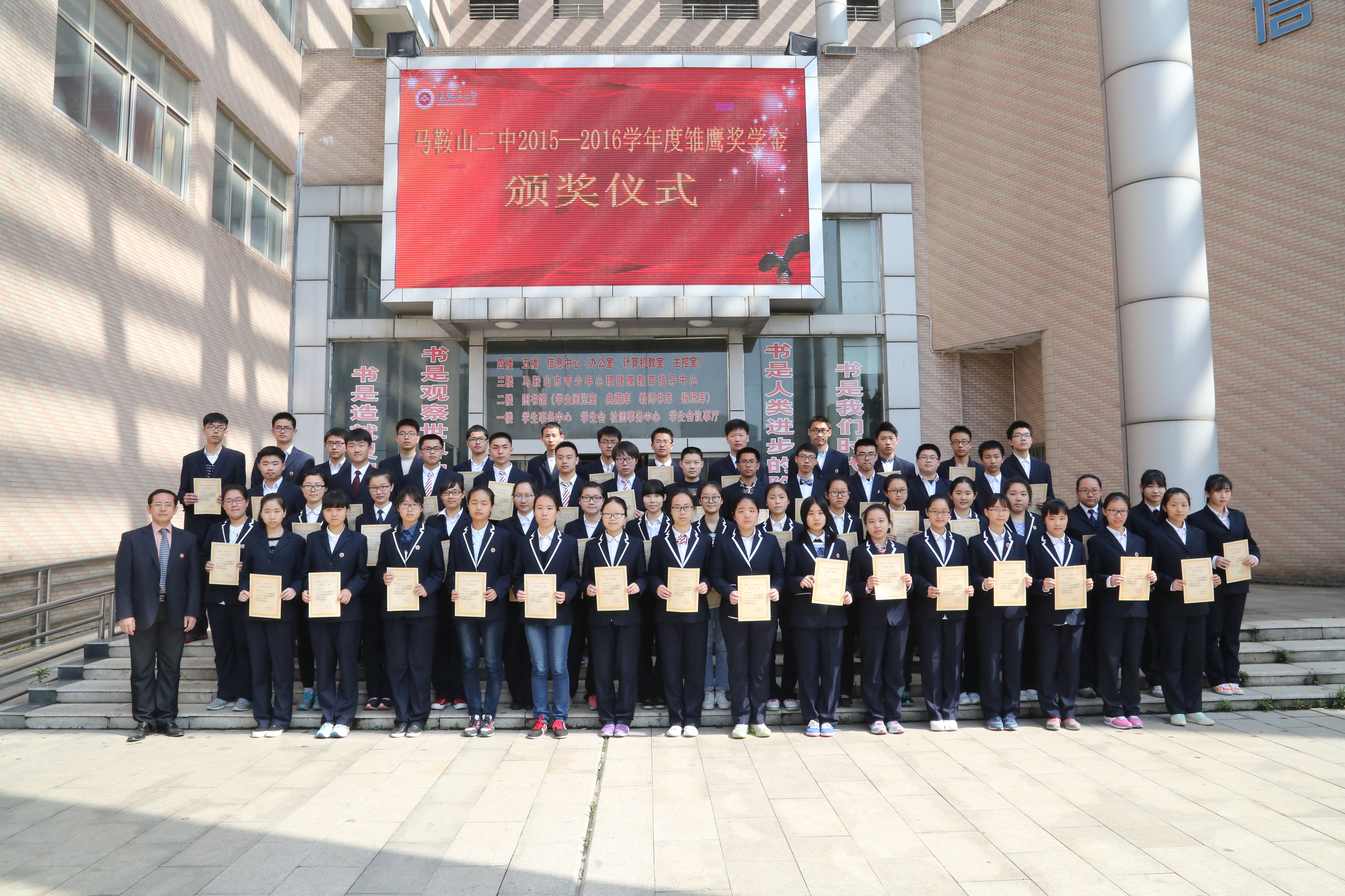 為鼓勵廣大學生努力學習、刻(kè)苦鑽研、奮發向上,樹立良好的學風和校風,根據《馬(mǎ)鞍山二中獎助學金實(shí)施方案》,經(jīng)推薦、評審、認定、公示無異議,決定授予張思成等58名同學馬鞍山二(èr)中2015-2016學年度雛鷹獎學金,共計獎學金63000元,望全校學生向他們學習,爭當優秀。