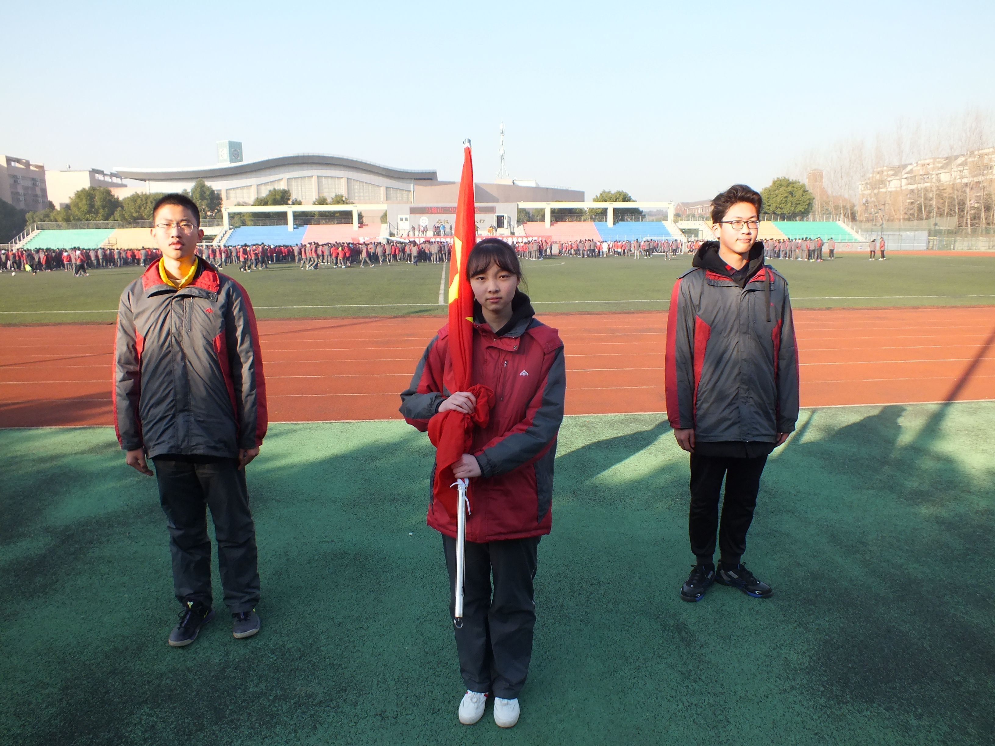 擔任今天(tiān)升旗儀式旗(qí)手的是來自高(gāo)一(17)班足球(qiú)隊啦啦隊隊長邵欣童同學。