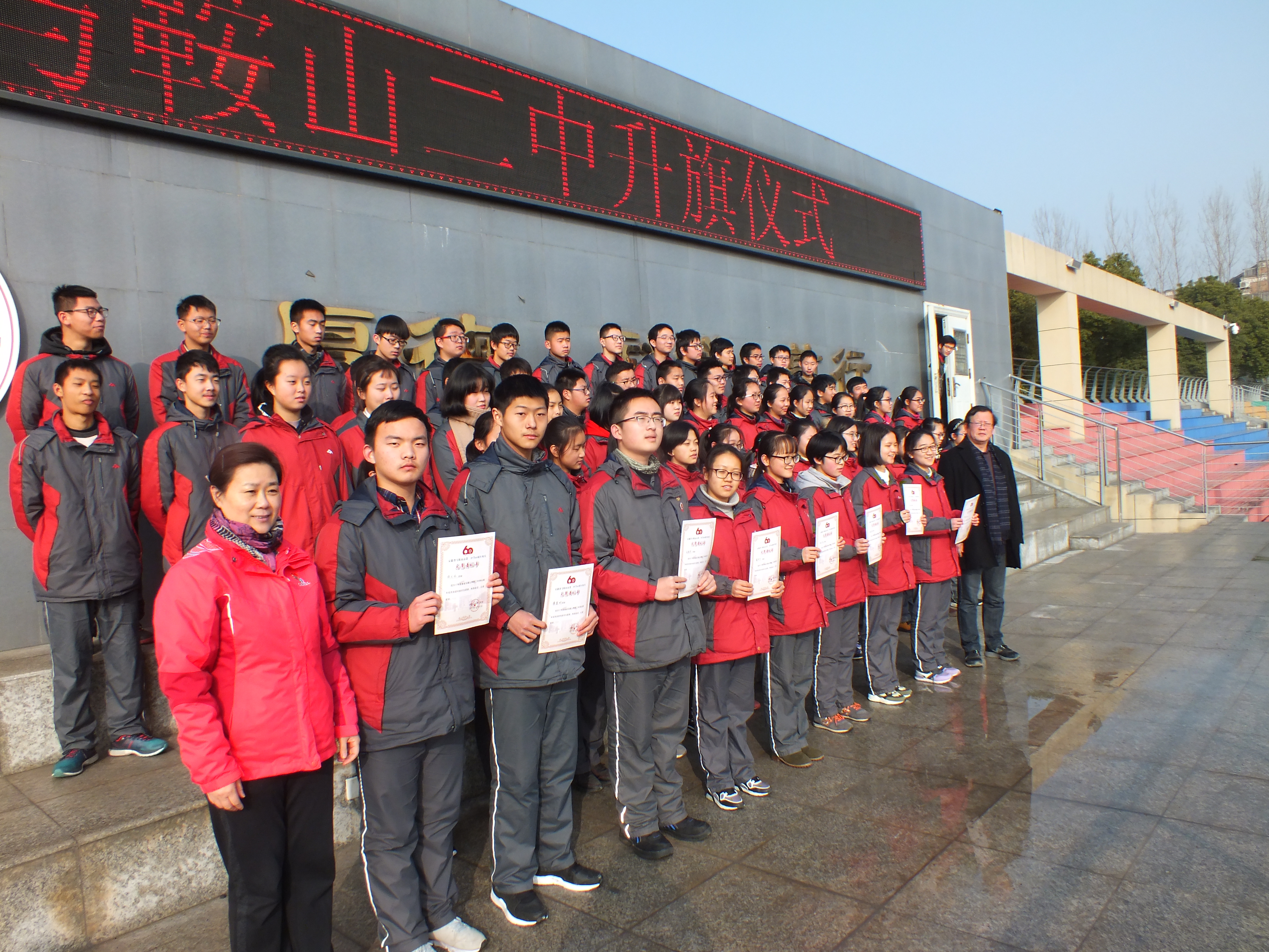 校領導為馬鞍山二中校慶60周(zhōu)年學生誌(zhì)願者代表頒發證書並合影(yǐng)。