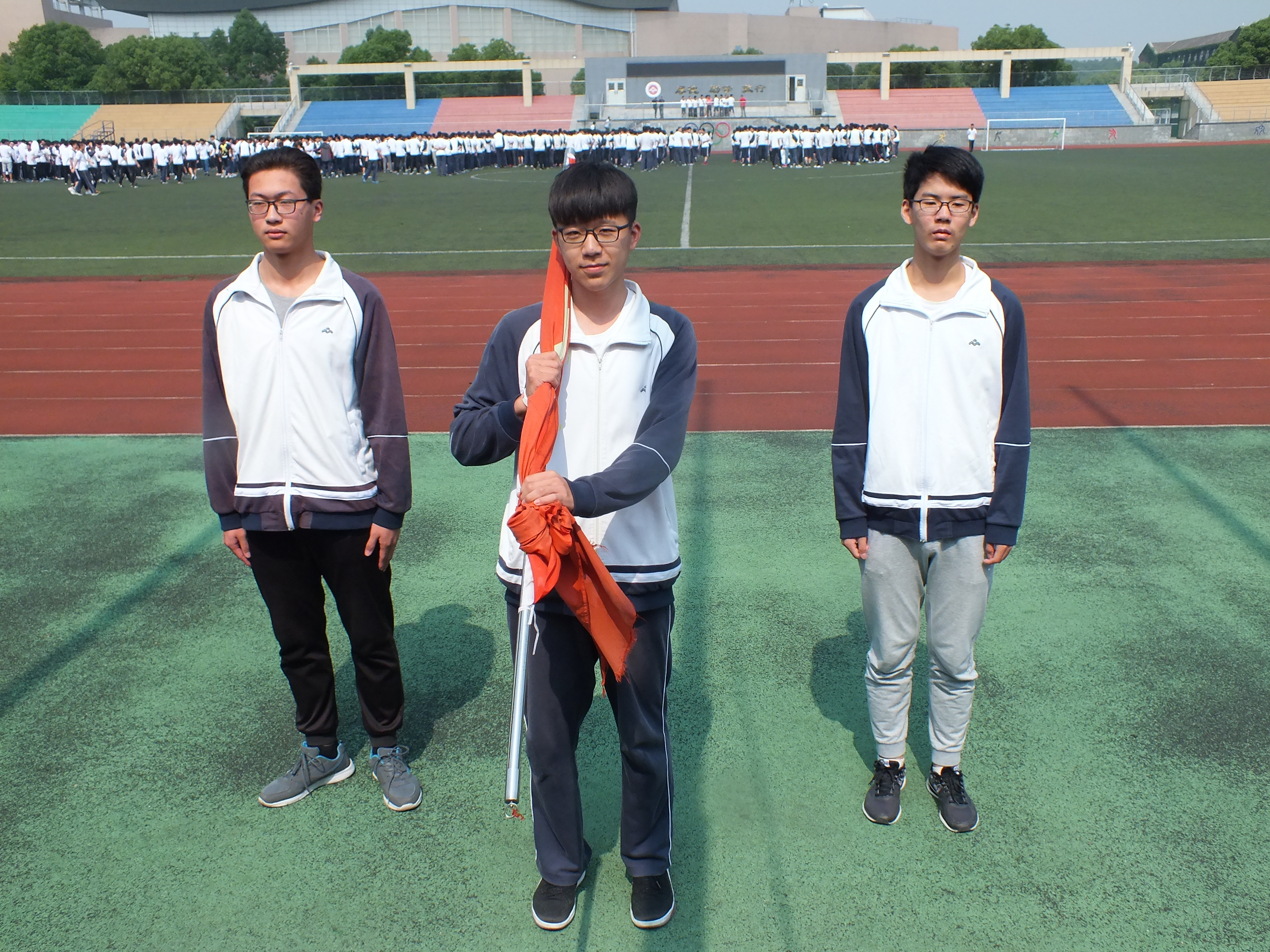 擔任今天升旗(qí)儀式旗手的是來自高二(14)班(bān)的陳家豪同學。