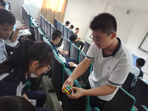 魔方(fāng)飛快轉動的聲音有節奏地響(xiǎng)著,緊張的計時聲和激烈的討論聲交織其中。一晃眼,在陽光明媚的正午,一場魔方教學在這激烈的討論中(zhōng)結束了。