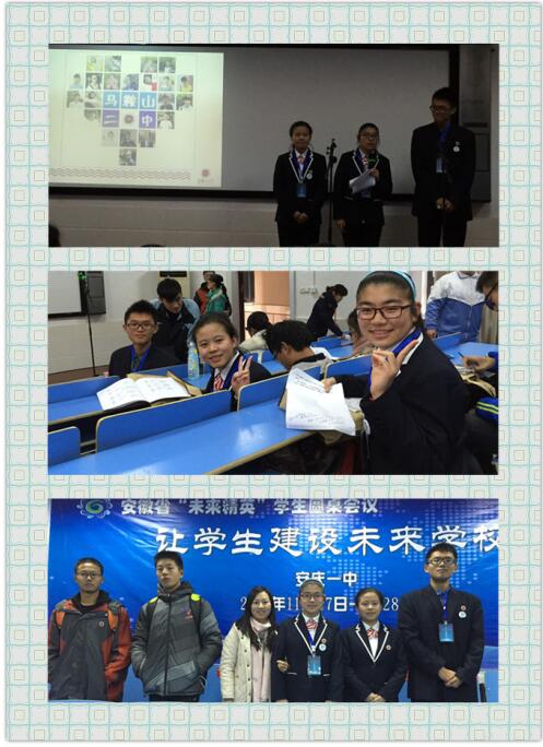 11月(yuè)27-28日,我校學生代表團赴安慶參加了安徽省“未來精英”學生圓桌會議。我校派出的學生(shēng)代表為學生會主席高(gāo)二(3)班張弛(chí)同學(xué)、學生會副主席高(gāo)二(10)班趙鈺(yù)穎(yǐng)同學(xué)、學生會副主席高二(3)班杜(dù)甜同學,鄭蒲港分校學生會主席趙宇灝同學、體育部副部長詹宇昊同學一同參加。本次圓(yuán)桌會(huì)議的(de)主題為:讓學生建設未來學校,本次會議分為成果分享會和分組討(tǎo)論會兩個階段(duàn)。