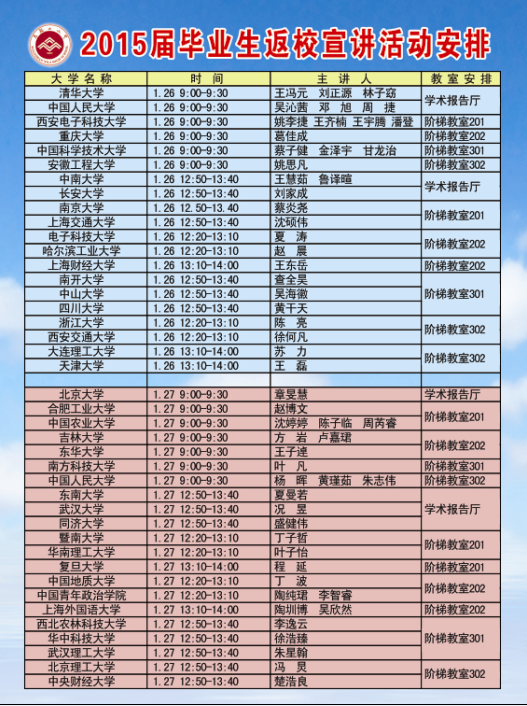 寒假將至,又迎來了畢(bì)業學子返校宣講的日子,2015屆優秀畢業生返校宣講會(huì)定於1月26-27日舉行,是(shì)由清華(huá)大學等41所高(gāo)校的同學精心為大家準備的“大學盛宴”。屆時請二(èr)中學子踴躍參加,希望通過此次活動能讓你(nǐ)們(men)更多的了解心目中的(de)理想大學。