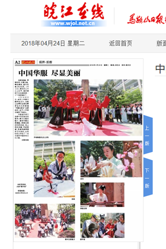 由我校團委主辦、馬鞍山二中崇寧國學社承辦的首屆“中國華服日”活(huó)動於4月18日在(zài)學校舉行,多家省市級媒(méi)體對該活動做了相關報道。