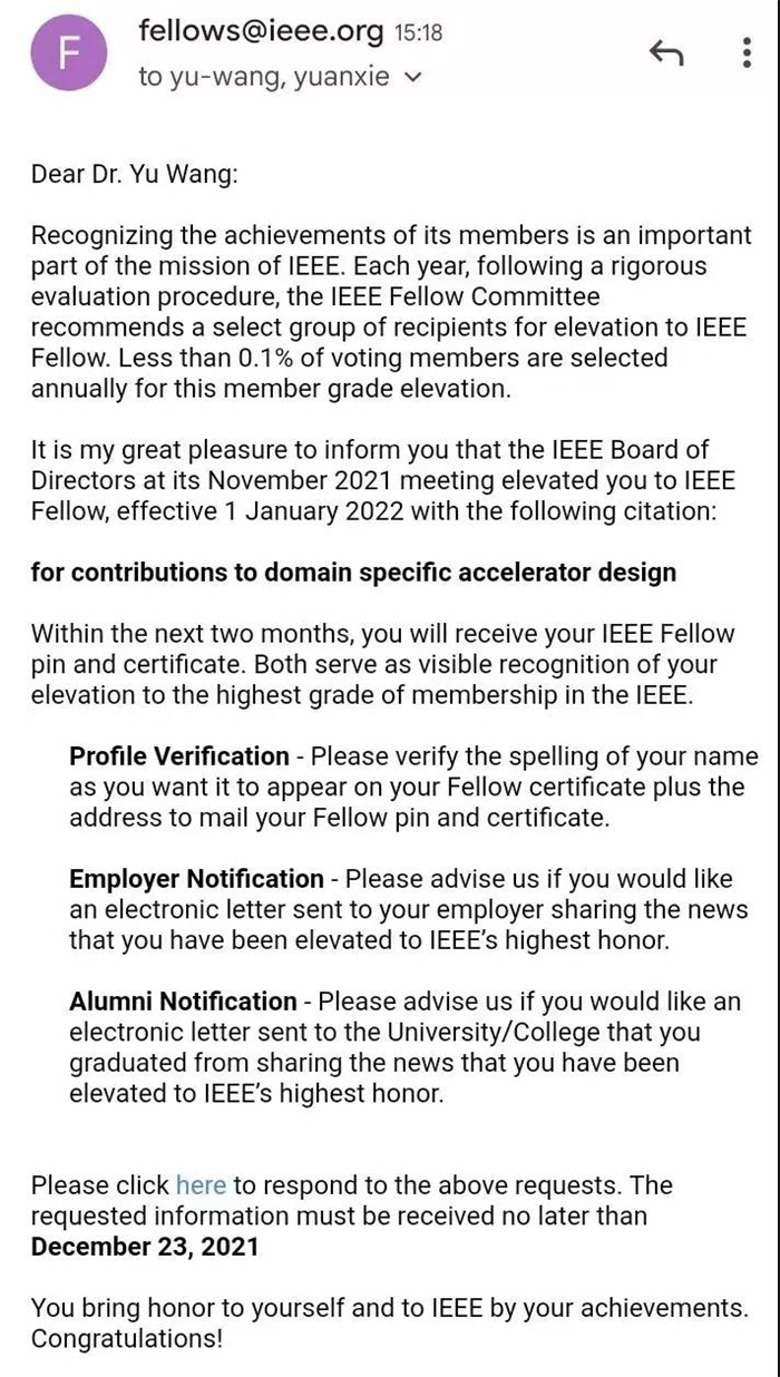 今年的(de)名(míng)單雖然還沒有公布,但入選的研究者已經陸陸續續收到了來自學會(huì)的郵(yóu)件,其中就包括清華大學電子工程係(xì)主任汪玉教授,他的獲獎理由是:對領(lǐng)域專用加速(sù)器設計做出了貢獻。