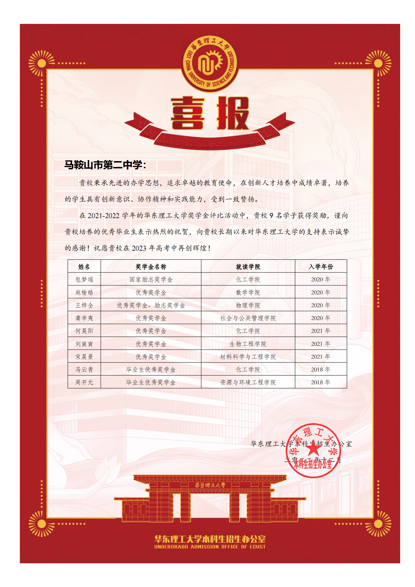 華東理工(gōng)大學向我校發來喜報