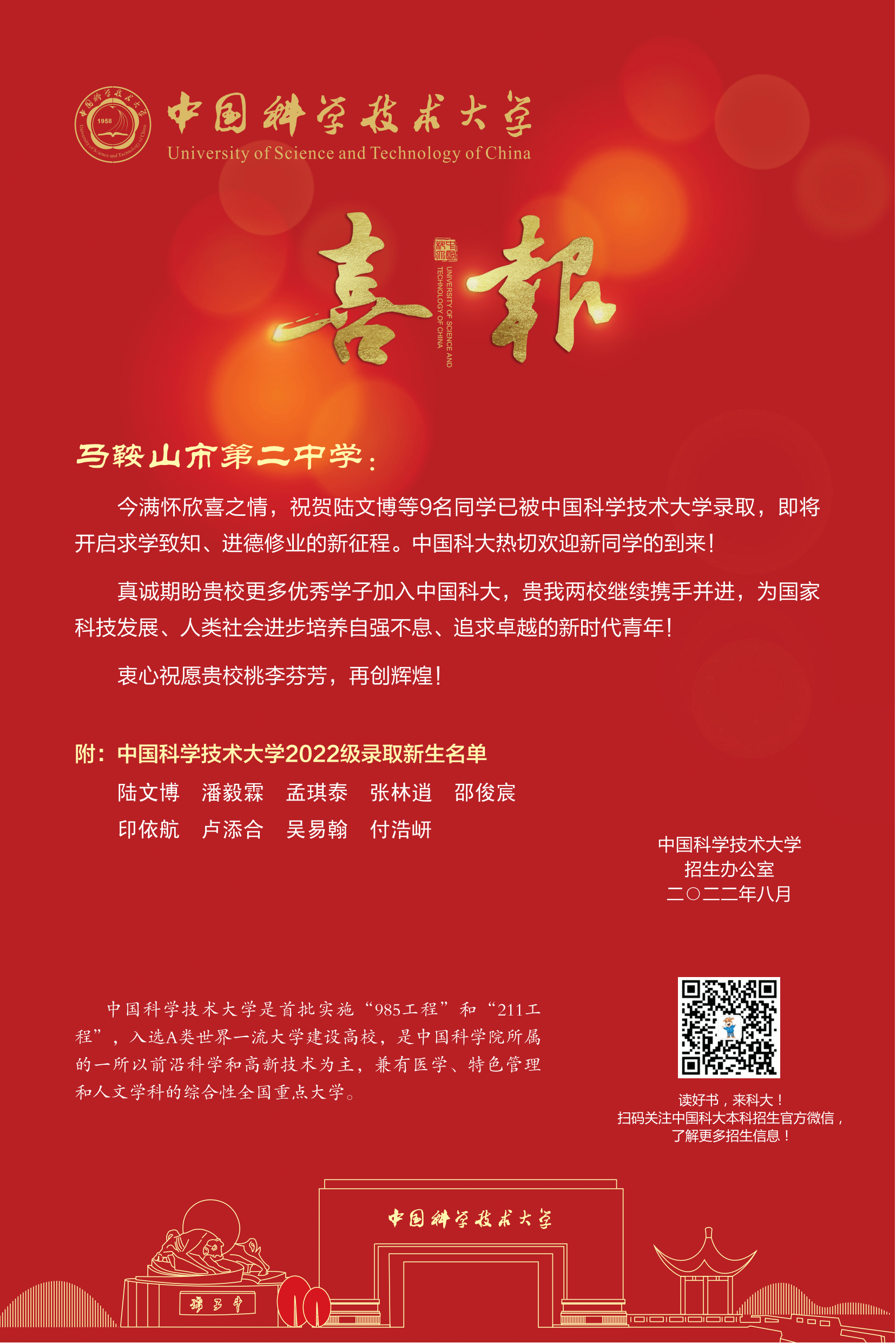 中國科(kē)學技術大學向我校發來喜報