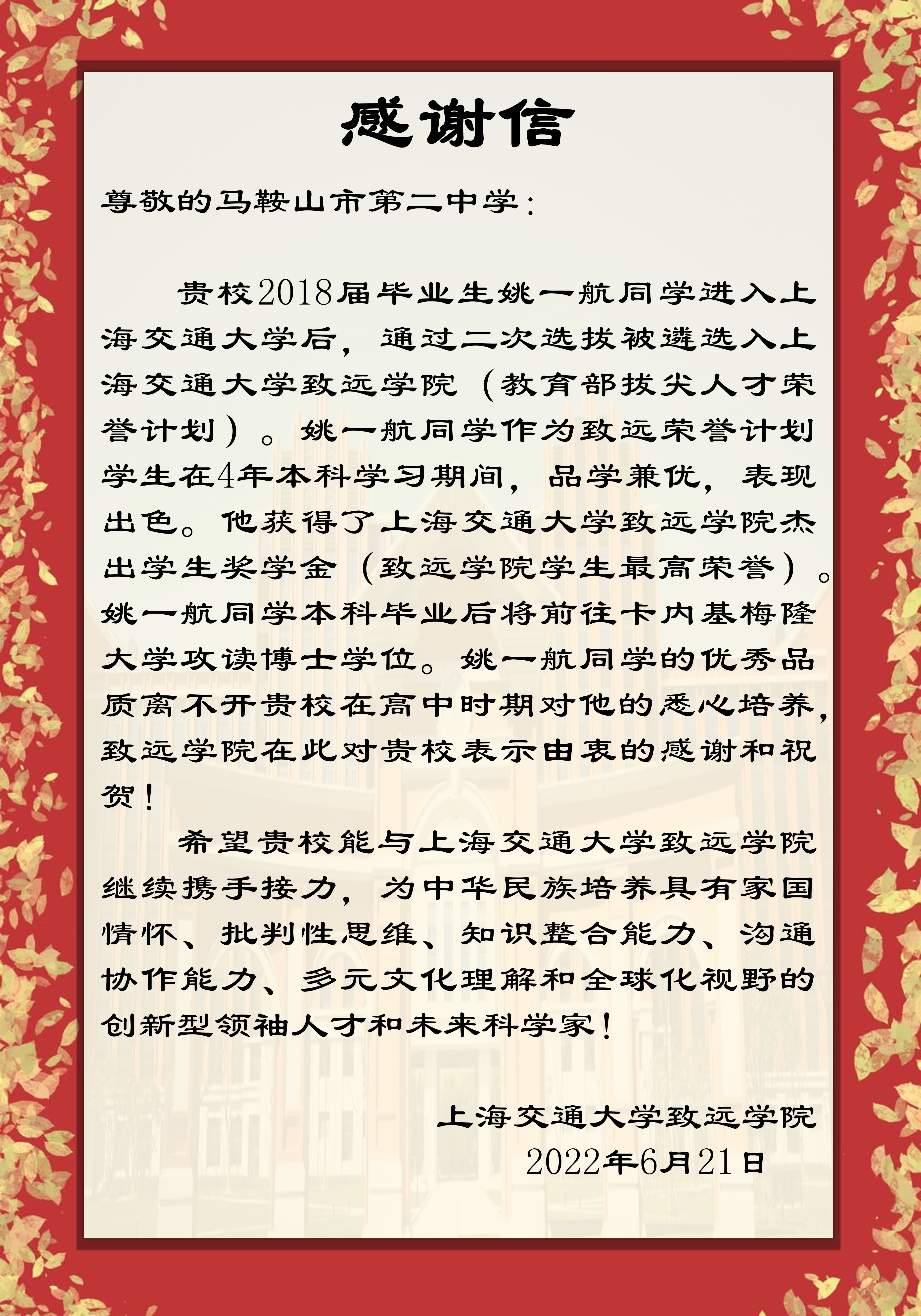 上海交通大學致(zhì)遠學院致馬(mǎ)鞍山市第二中學的感謝信