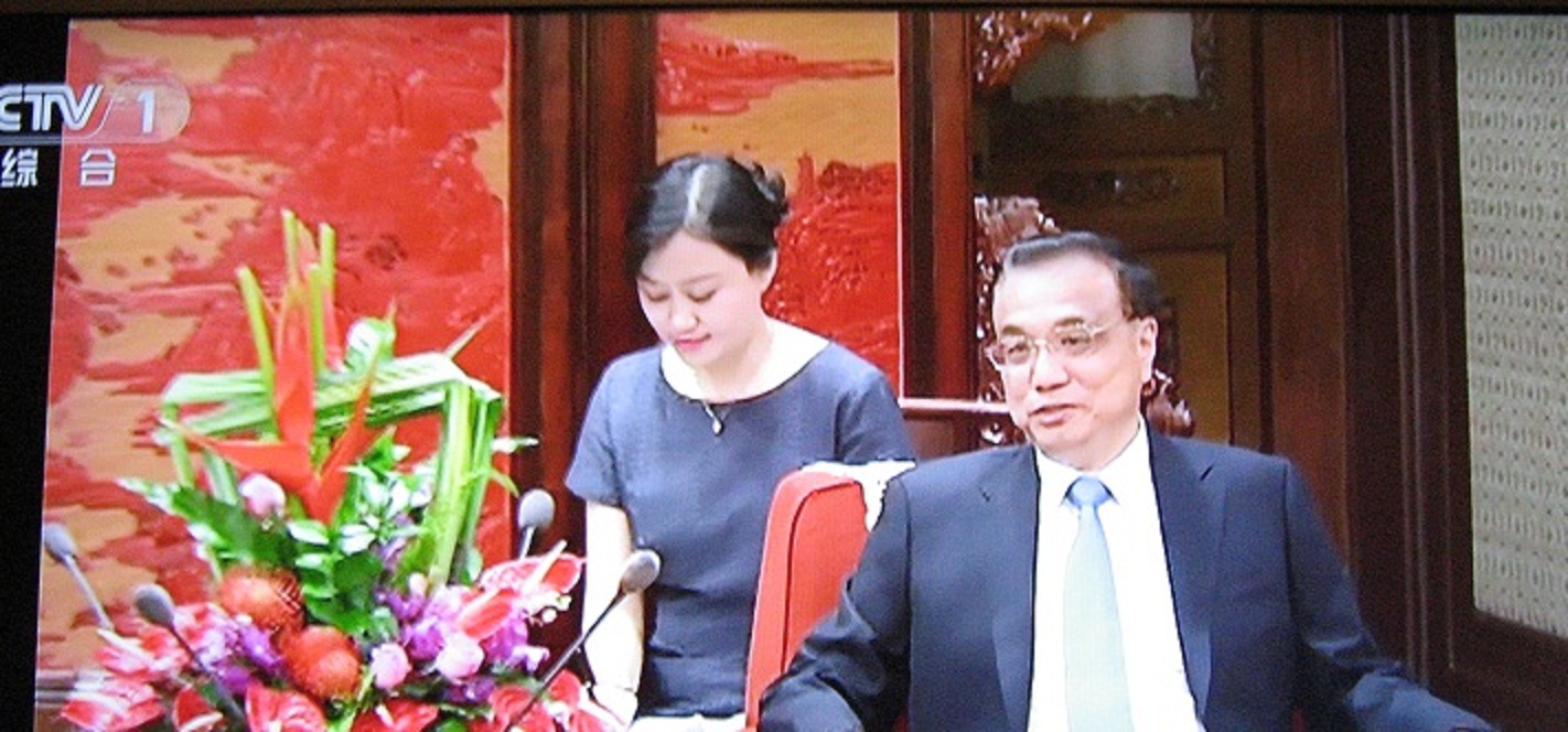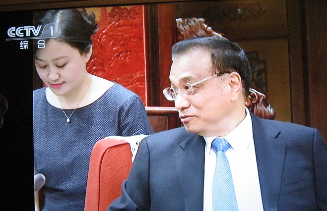 以上兩個畫麵中,坐在李總理後麵的就是我校93屆畢業(yè)生熊焰,她正在為李總(zǒng)理做翻譯。