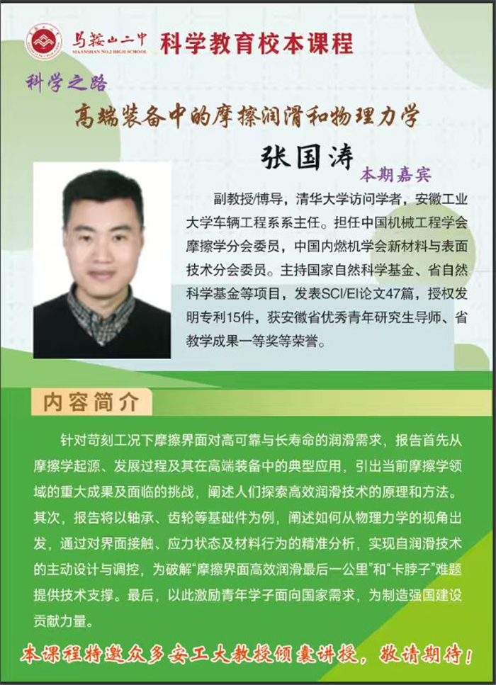 10月29日,馬鞍山二中再度(dù)邀請高校專家走進校園,為學子們帶(dài)來一場聚焦高端裝備核心技術的科學盛宴。本次活(huó)動特邀安徽(huī)工業大學車輛工程係係主任、博士生導(dǎo)師張國(guó)濤教授主講,以“高端裝(zhuāng)備中(zhōng)的摩擦潤滑和物理力學”為(wéi)主題,帶領同學們探索藏(cáng)在機(jī)械運轉背後的科學原理,感受基礎研究如何為國家製造強國戰略提供關鍵支撐。