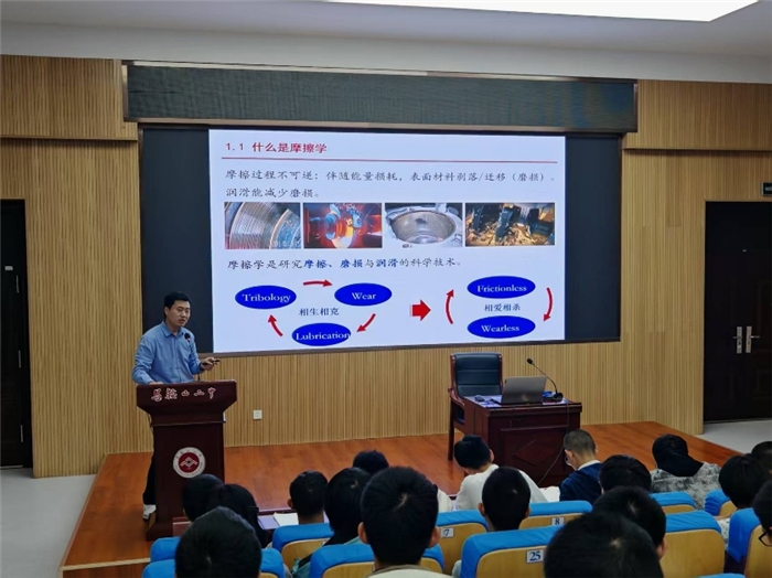 講(jiǎng)座開場(chǎng),張國濤副教授並未直(zhí)接切入深奧理(lǐ)論,而是從同(tóng)學(xué)們熟悉的生活場景引(yǐn)入——“自行車(chē)騎久了為何會‘吱呀’作響?汽車發動機為何需要定期換機(jī)油?” 兩(liǎng)個貼近日常的問題,瞬間勾起全場同學的好奇心,自然引出“摩擦學”這一核心主題。他通(tōng)過動態示意(yì)圖(tú),清晰梳理了摩擦學在現代成為交叉學科的發展脈絡,讓同學們明白:小(xiǎo)到文(wén)具、大(dà)到航(háng)空發(fā)動機,摩擦潤滑都在默默影響著設備的可靠性與壽命,而這正是高端裝備製造中不可或缺的“隱形基石”。