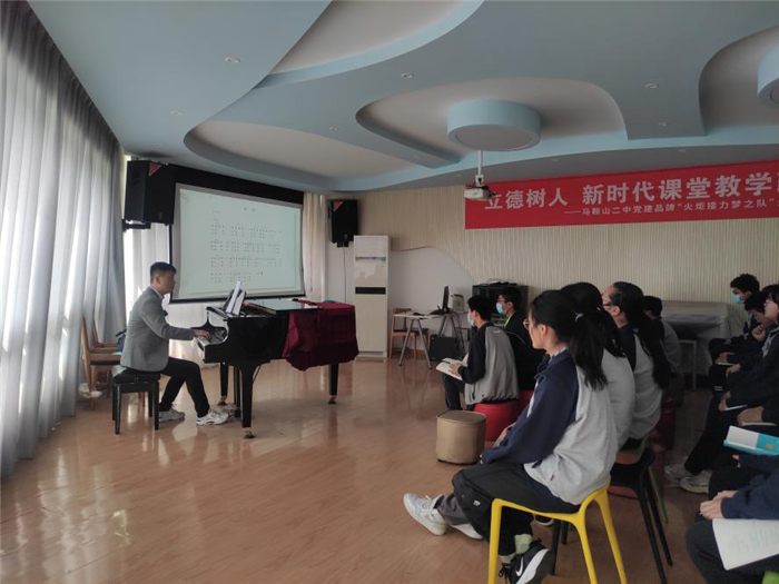 馬鞍(ān)山二中火炬接力課堂教學周音樂匯報(bào)課於2022年(nián)5月12日上午第二、三兩(liǎng)節課在(zài)校藝術中心舉行,授課老師分別(bié)由博(bó)望分校的屈海兵老師和鄭蒲港分校的陳亞琦老師,二(èr)中黨委副書記聶曉霞、工會主席畢小紅、市音樂教研員李善忠老師以及全市三區三縣的高中音樂教師共二十多人參加了聽課、評課交(jiāo)流活動。