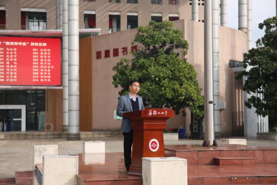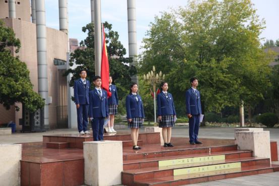 伴隨著雄壯激(jī)昂的國歌聲,五星紅旗冉(rǎn)冉升起。全體師生肅立,同唱國歌。