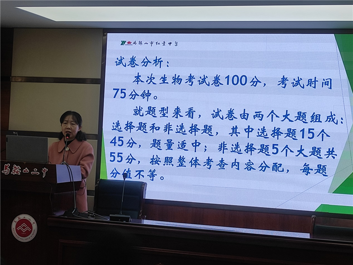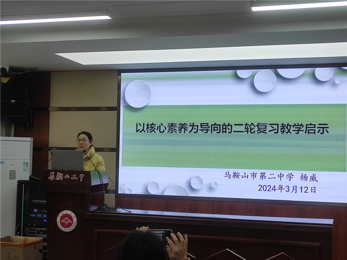 馬鞍山(shān)二中教研組長楊威老師(shī)介紹了二中生物(wù)組的教研情況,分享了複習(xí)備考方麵的個人經驗。她認為二輪複習過程中(zhōng)應該以專(zhuān)題的形式強(qiáng)化主幹,並在常(cháng)態教學中深析(xī)教材,提升能力,注重組織和指導學生在複(fù)雜情境(jìng)中解決問題。